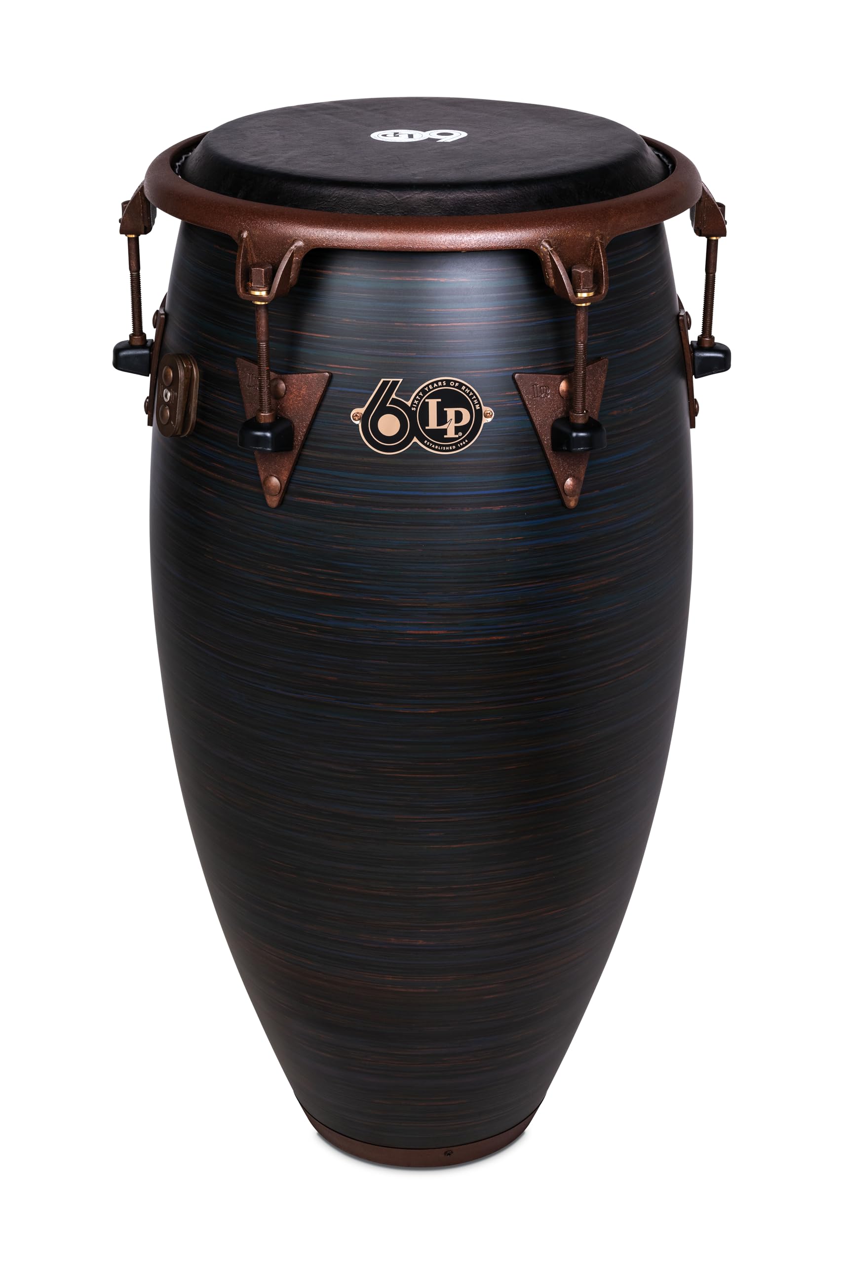 LP is celebrating its 60th Anniversary with this commemorative collection of drums. The Kevlar-reinforced fiberglass shells pay tribute to LP’s first conga drums made of fiberglass while Top-Tuning hardware represents LP’s latest evolution in conga technology. This 11-3/4″ Conga with special fiberglass shells produce deep, resonant bass with cutting highs. The hand-painted Roasted Hazel finish with Rustic Bronze hardware ensures that each drum is unique. Emblazoned with a commemorative LP60 badge, these drums are limited production for 2024.