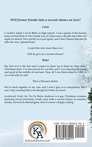 Will former friends take a second chance on love? Caleb I couldn’t admit I loved Blake in high school. I was captain of the hockey team and terrified of who I really was. It’s been over a decade since that one night we shared. He’s prickly as a porcupine, and I don’t blame him one bit after the way I ghosted him. I want him now more than ever. Will he give us a second chance? Blake My first love is the last man I expect to show up to help me chop down Christmas trees. I’ve downsized for van life, and I was enjoying the peace and quiet in the middle of nowhere. Now all I can think about is Caleb as we work side by side. Then a blizzard strikes. We’re stuck together in my van, and I won’t give in to temptation. But I can’t stop wanting him even though he broke my heart… Lumberjack Under the Tree by Keira Andrews is a gay Christmas romance featuring forced proximity, lonely men with a second chance at romance, steamy snowed-in shenanigans, and of course a happy ending.
