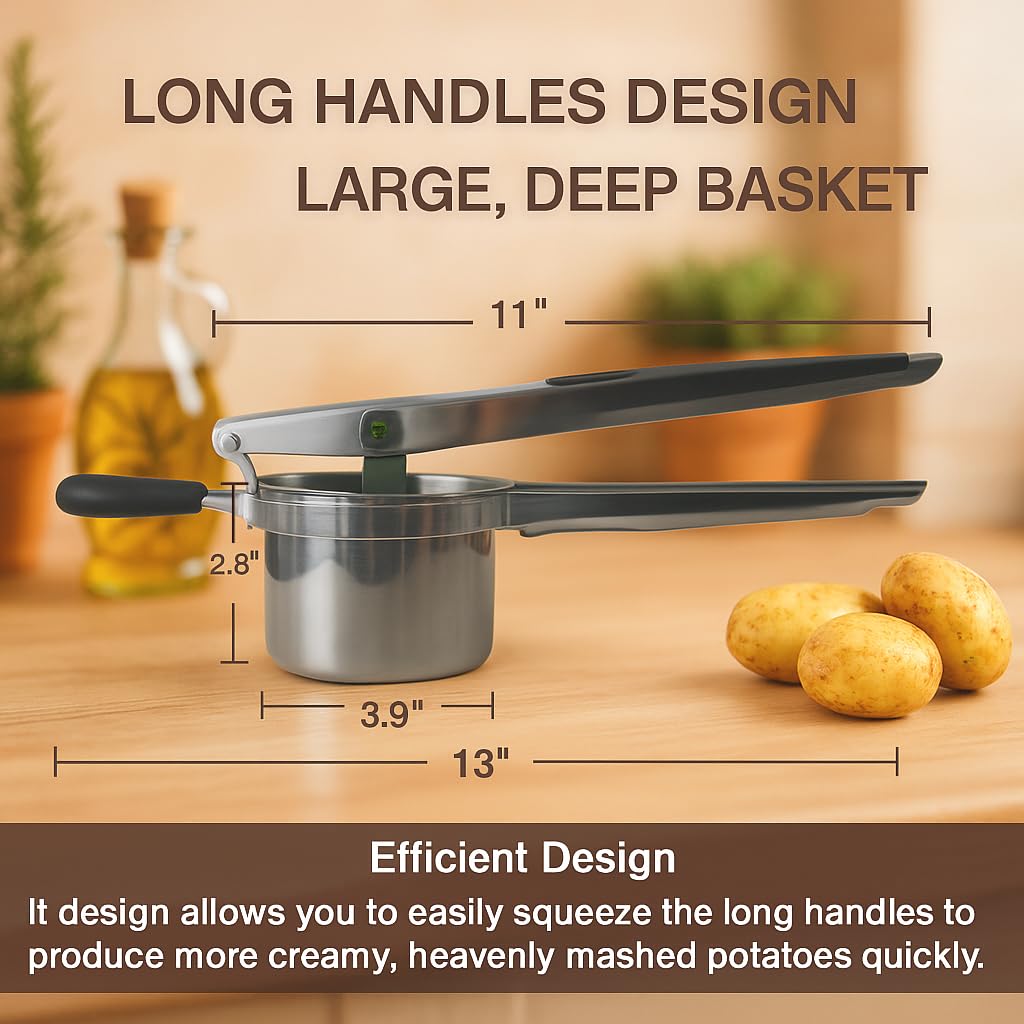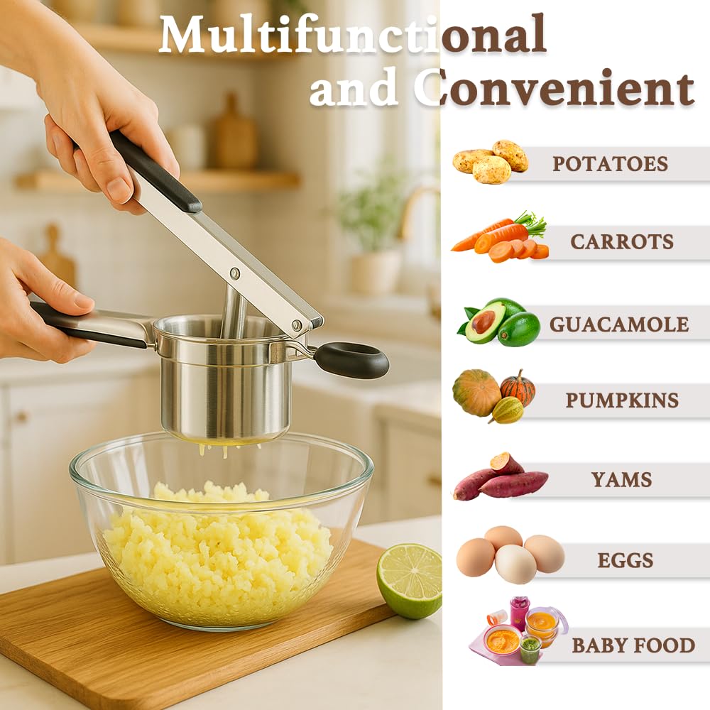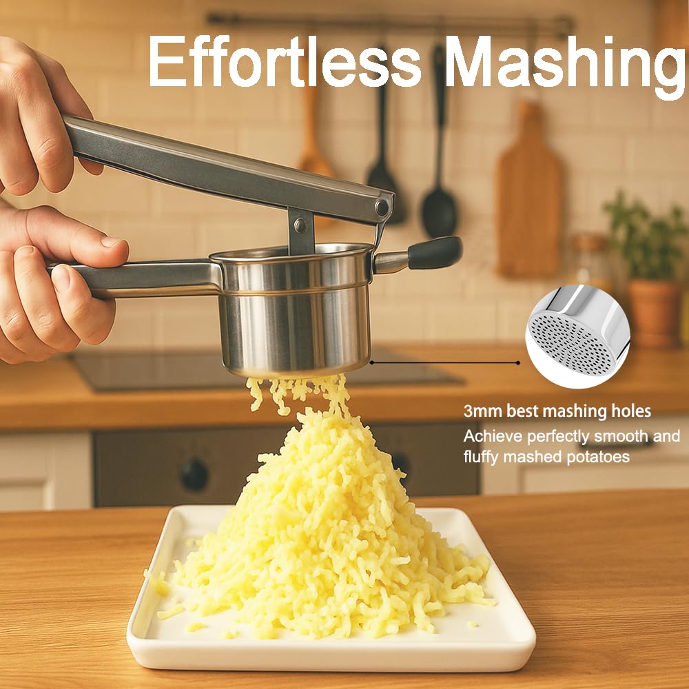 - [Multifunctional and Convenient]-This potato ricer features a large, deep basket, allowing you to mash more potatoes at once. The 3mm holes are perfect for making not only mashed potatoes but also pumpkin puree, fruit puree, gnocchi, and more, making it an essential potato masher for quickly preparing healthy home-cooked meals.