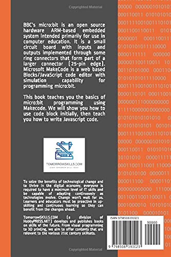BBC’s micro:bit is an open source hardware ARM-based embedded system intended primarily for use in computer education. It is a small circuit board with inputs and outputs implemented through some ring connectors that form part of a larger connector (25-pin edge). Microsoft MakeCode is a web based Blocks/JavaScript code editor with simulation capability for programming micro:bit. This book teaches you the basics of micro:bit programming using Makecode. We will show you how to write Javascript code to accept inputs and manipulate the LED display using different code structures including variables, logical control, and loops.