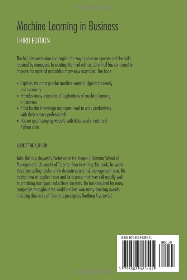 THIRD EDITION OF MACHINE LEARNING IN BUSINESS This book is for business executives and students who want to learn about the tools used in machine learning. In creating the third edition, John Hull has continued to improve his material. He has added new case studies and new material on the applications of neural networks. The book explains the most popular algorithms clearly and succinctly without using calculus or matrix/vector algebra. The focus is on business applications. There are many illustrative examples throughout the book. These include assessing the risk of a country for international investment, predicting the value of real estate, classifying retail loans as acceptable or unacceptable, understanding the behavior of interest rates, using neural networks to understand volatility surface movements, and using reinforcement learning for optimal trade execution. Data, worksheets, and Python code for the examples is on the author’s website. A complete set of PowerPoint slides that can be used by instructors is also on the website. The opening chapter reviews different types of machine learning models. It explains the role of the training data set, the validation data set, and the test data set. It also explains the issues involved in cleaning data and covers Bayes’ theorem. Chapter 2 is devoted to unsupervised learning. It explains the k-means algorithm and alternative approaches to clustering. It also covers principal components analysis. Chapter 3 explains linear and logistic regression. It covers regularization using Ridge, Lasso, and Elastic Net. Chapter 4 covers decision trees. It includes a discussion of the naive Bayes classifier, random forests, and other ensemble methods. Chapter 5, explains how the SVM approach can be used for both linear and non-linear classification as well as for the prediction of a continuous variable. Chapter 6 is devoted to neural networks. It includes a discussion of the gradient descent algorithm and stopping rules. Chapter 7 covers autoencoders, variational autoencoders, generative adversarial networks, convolutional neural networks, and recurrent neural networks. Chapter 8 explains reinforcement learning using two games as examples. It covers Q-learning and deep Q-learning, and discusses applications. Chapter 9 covers natural language processing. It discusses how the algorithms introduced in the book can be used for sentiment analysis, language translation, and information retrieval. Chapter 10 is concerned with model interpretability. It discusses the importance of making models understandable and the procedures that can be used for both white-box and black-box models. The final chapter focuses on issues for society. The topics covered include data privacy, biases, ethical considerations, legal issues, and adversarial machine learning. At the ends of chapters there are short concept questions to test the readers understanding of the material and longer exercises. Answers are at the end of the book. The book includes a glossary of terms and an index.