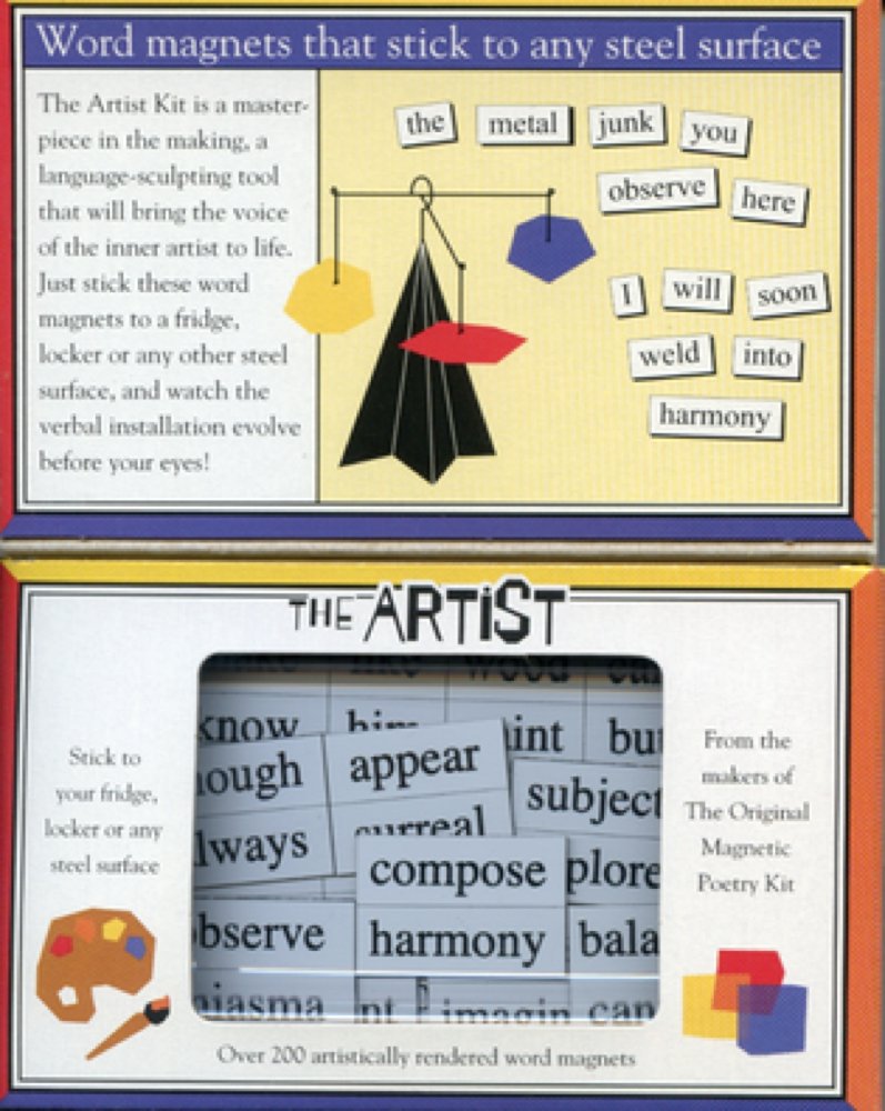 - A carefully crafted composition of artistically rendered magnetic word tiles drawn from the voice of the creative mind. This masterful collection has words like surreal, absurd, sculpt, metaphor, silhouette and latex.