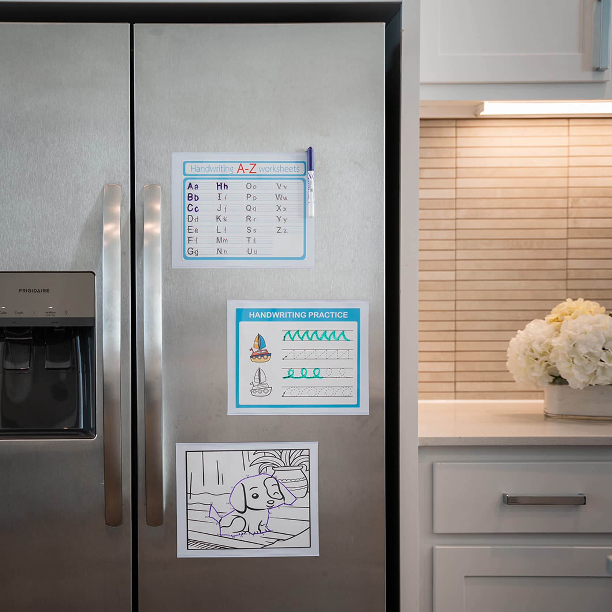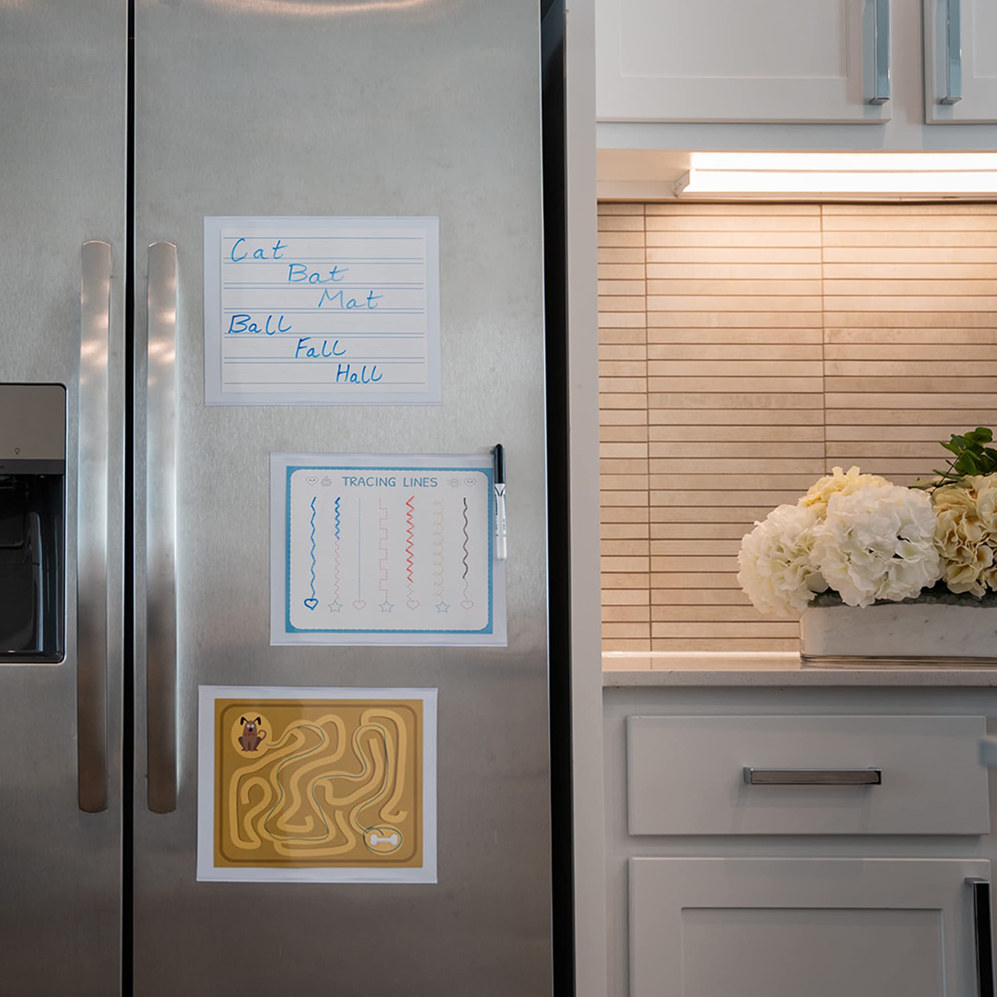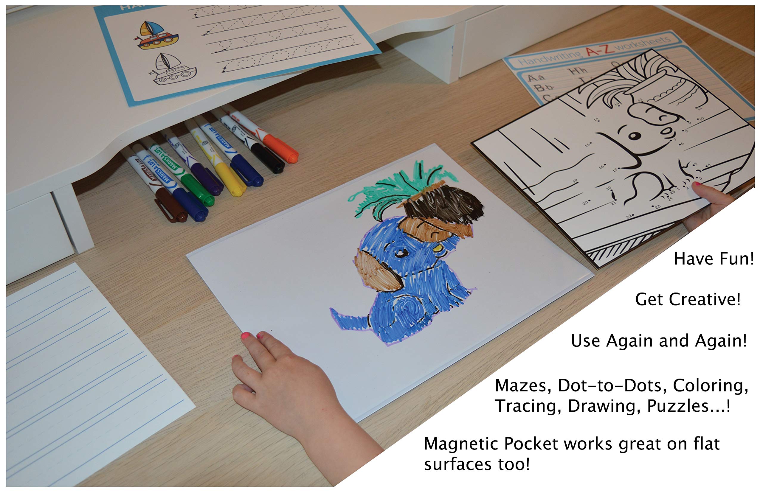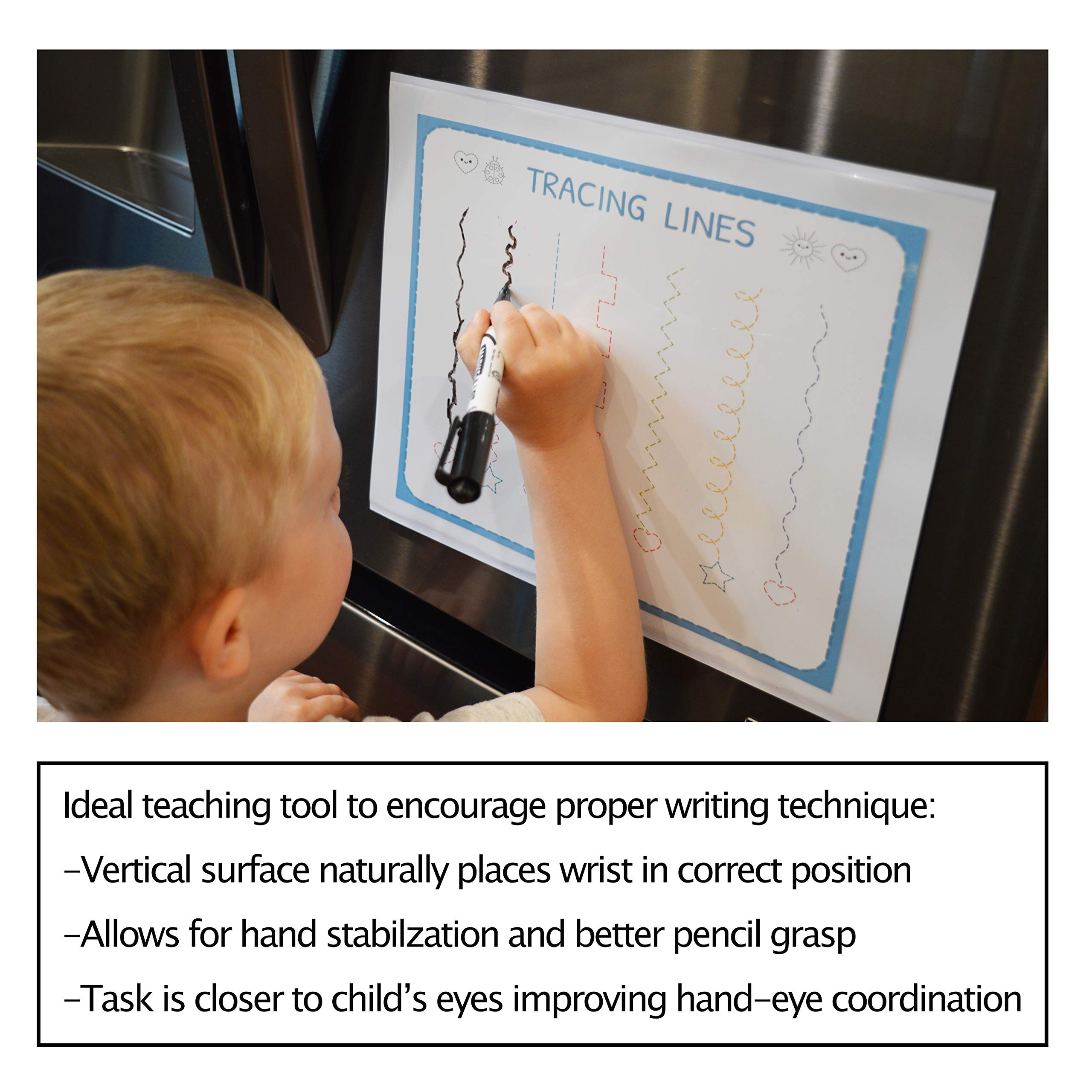 Magtech’s Wipe-Clean 8. 5 x 11 inch Magnetic Dry Erase Kid’s Activity Pockets feature a clear, acid free surface that works well with dry erase markers and wipes clean to be reused over and over again. The activity pocket sleeve is a perfect addition for any parent looking to add another way to capture your child’s imagination and make learning fun. Includes (3) 8. 5 x 11 inch full back magnetic sleeves and 3 double sided 8 x 10 sheets – that help teach letters, numbers, shapes, and motor skills. Great value to get you started, but the options with this product are truly only limited by your imagination. We recommend searching Pinterest and Google for fun activities from puzzles to mazes to color by number or even use to create a custom chore chart – then wipe clean to use again! Wipe-Clean Magnetic Activity Pockets are the ideal teaching tool to encourage better writing. Studies have indicated that writing on a vertical surface naturally puts the wrist in the correct extended position and allows for hand stabilization and better pencil grasp to control writing utensils. A vertical surface brings the task closer to the child’s eyes to encourage hand-eye coordiation and helps improve overall posture as well!