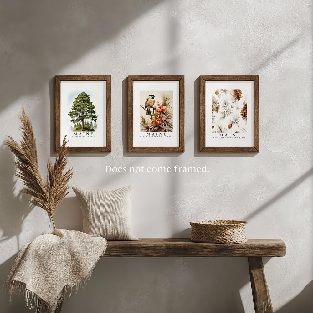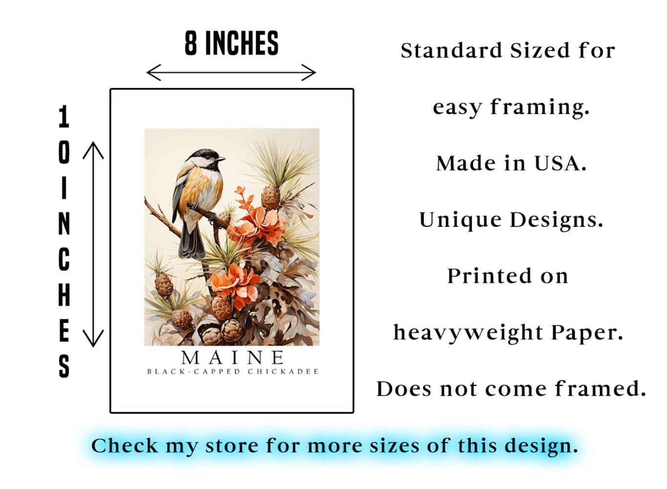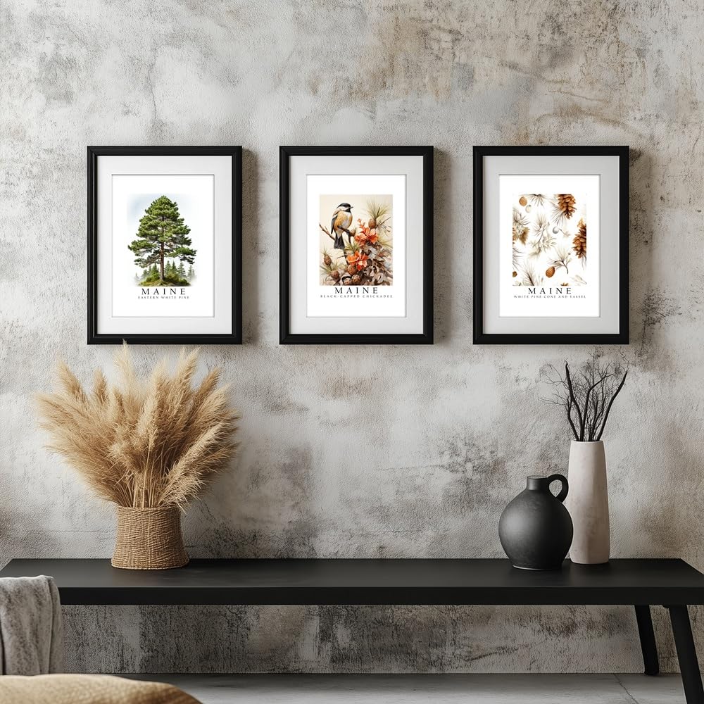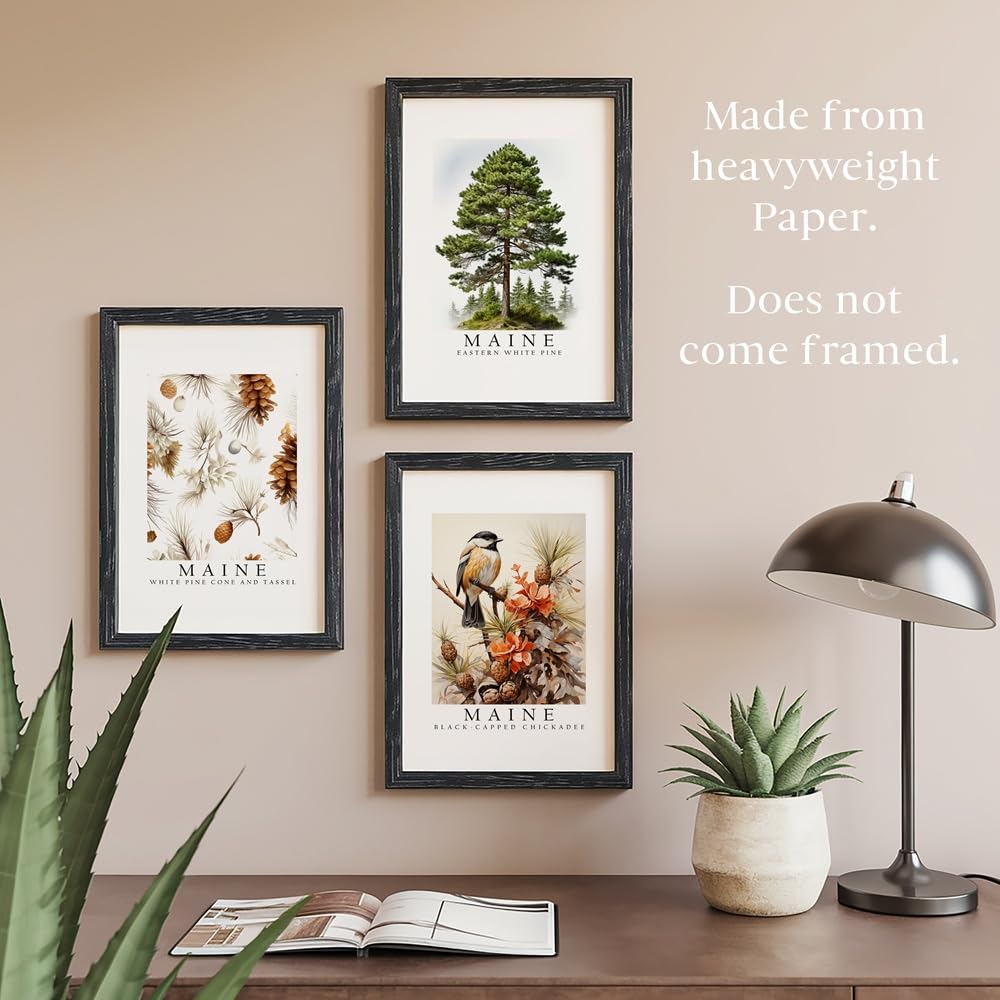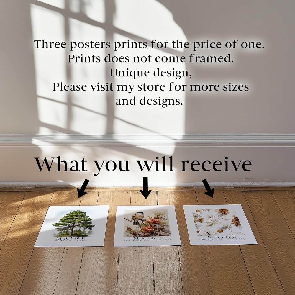 Elevate your space with the essence of Maine’s natural beauty encapsulated in our Maine Symbols State Posters Set. Each poster features a quintessential symbol of Maine’s landscape and wildlife, meticulously crafted to capture the state’s charm and character. In this set, you’ll find three stunning 8 x 10 inch posters showcasing iconic Maine symbols: Black Capped Chickadee Bird: Celebrate the spirited presence of the black-capped chickadee, Maine’s state bird. Known for its cheerful call and lively demeanor, this bird symbolizes the resilience and vitality of Maine’s wilderness. White Pine Cone Flower: Admire the delicate allure of the white pine cone flower, a native wildflower of Maine. Its graceful petals and subtle fragrance evoke the tranquility and elegance of Maine’s forests, adding a touch of natural sophistication to any space. Eastern White Pine Tree: Immerse yourself in the majesty of the Eastern white pine, Maine’s state tree. Towering and majestic, this tree embodies the strength, endurance, and timeless beauty of Maine’s landscape, serving as a steadfast symbol of resilience and growth. Crafted with care and attention to detail, these posters are perfect for adorning your walls with a touch of Maine’s spirit. Whether you’re a proud resident, a nature enthusiast, or simply drawn to the rustic charm of Maine, this set of state posters is sure to inspire and delight. Add a dash of Maine’s allure to your home, office, or classroom with our Maine Symbols State Posters Set and let the essence of the Pine Tree State captivate your surroundings.