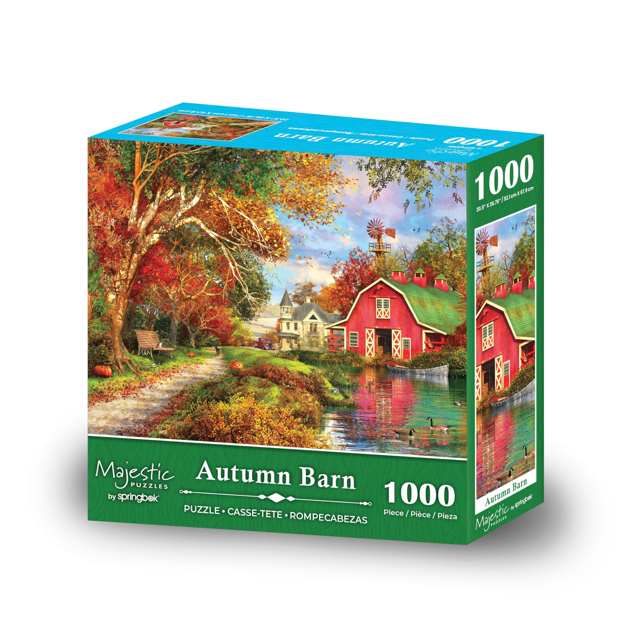 The 1000 piece jigsaw puzzle for adults features a vibrant autumn scene set in the countryside. A red barn with a green roof stands prominently by a calm pond, reflecting the colorful foliage and blue sky above. The surrounding trees are adorned in rich hues of orange, yellow, and red, capturing the essence of fall. A quaint path lined with pumpkins leads toward a charming farmhouse, complete with a steeple and a windmill in the distance. The peaceful setting is complemented by ducks swimming in the pond and a classic bench invitingly placed under the trees, creating a warm and picturesque rural landscape. Majestic jigsaw puzzles offer exceptional value and are the perfect gift for puzzle enthusiasts. Crafted from thick, durable cardboard, these puzzles ensure a snug, satisfying fit with every piece. Proudly made in the USA using recycled materials, Majestic puzzles combine quality with sustainability. The ribbon-cut pieces are expertly designed to fit seamlessly, providing a rewarding challenge for puzzlers of all levels.