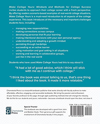 Most people think that getting ready to start college classes means buying a textbook and reading a syllabus. In reality, entering college is like entering a whole new world with new expectations and ways to interact and grow. The transition is rarely easy, but you can take ownership of your experience in college. Make College Yours: Mindsets and Methods for College Success is designed for students in First Year Experience or similar courses at the college level. This text combines evidence-based instructional content with insightful anecdotes from students of varying backgrounds. In this book, you’ll find personal stories of college students grappling with the same problems and issues you’ll grapple with, stories that are as relatable as they are complex. In these pages, you’ll find lots of helpful lessons about the basics of starting college, like: * Improving study skills * Combating test anxiety * Being a good group member * Developing a growth mindset * Making campus connections * Becoming an active learner Make College Yours goes way beyond the basics, too. This book will also teach you about major life skills, including: * Learning to persist through difficult times * Managing negative emotions * Understanding personal agency * Making wise choices * Taking responsibility for your own growth * Overcoming procrastination