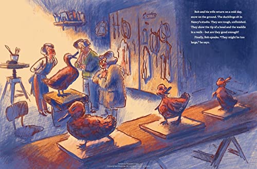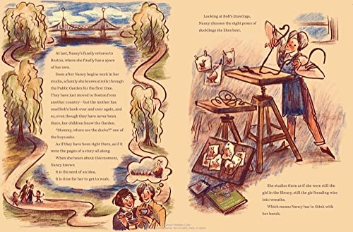 A beautiful and fascinating picture book biography that follows the lives of Robert McCloskey, creator of Make Way for Ducklings, and sculptor Nancy Schon, whose famous bronze ducks grace Boston Public Garden. In the beginning, there was a boy named Robert McCloskey, growing up in Ohio, his hands always moving, always creating. Many years later, after attending art school in Boston, he would reflect on his days wandering through Boston Garden and write the classic picture book Make Way for Ducklings. In the beginning, there was also a girl named Nancy Schon. She grew up in Newton, Massachusetts, working in her father’s greenhouse, twisting wire and boughs into wreaths. Many years later, Nancy would look at Robert’s drawings in Make Way for Ducklings and get the seed of an idea. That seed became the beloved bronze sculptures of Mrs. Mallard and her eight ducklings that stand in Boston Garden today. This stunning and clever picture book biography intertwines the lives of two phenomenal artists–who were contemporaries and friends–and reveals the extraordinary impact they’ve had on generations of children.