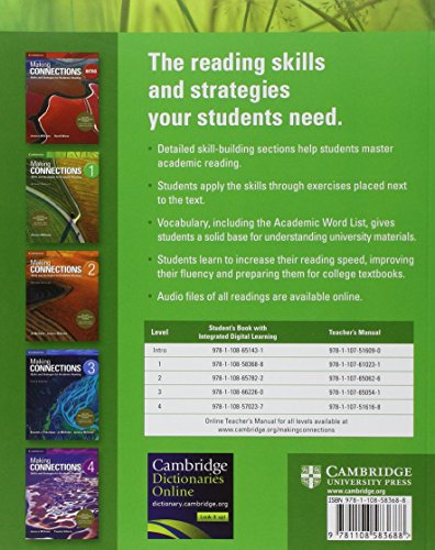 Making Connections Second edition teaches an extensive range of reading skills and strategies to prepare students for the challenges of reading college textbooks. Making Connections Second edition Level 1 Student’s Book introduces first-time readers of academic text to basic reading strategies such as finding paragraph topics, finding supporting details and learning to read quickly. It features a variety of high interest topics including national borders, names, food, sleep, natural disasters, and music. Each Student’s Book contains a single-use code to access an eBook and downloadable audio files of the readings in Cambridge One.