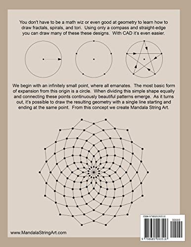 You don’t have to be a math wiz or even good at geometry to learn how to draw fractals, spirals, and tori. This book shows you how. Beautifully illustrated cover-to-cover with over a hundred full-color pictures and 800+ drawings. We begin with an infinitely small point, where all emanates. The most basic form of expansion from this origin is a circle. When dividing this simple shape equally and connecting these points continuously beautiful patterns emerge. As it turns out, it’s possible to draw the resulting geometry with a single line starting and ending at the same point. From this concept we create Mandala String Art. Tibetan Buddhists define Mandala as “an integrated structure organized around a unifying center”. The word itself is ancient Sanskrit synonymous with ‘circle’. This is the language of Sacred Geometry. Starting with a dot and expanding to a circle, creating the Circumpunct, then dividing equally and connecting these new points we create the symbols of ancient religion and philosophy. Pythagoreans used the circled dot to represent the first metaphysical being, the Monad (or The Absolute) and in Neoplatonism the universe emanated from this (The One), also named Bindu, “the sacred symbol of the cosmos in its unmanifested state”. “Geometry provided God with a model for the Creation” – Johannes Kepler