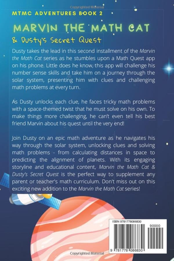 A Space-Themed Math Adventure Awaits! — Book 2 in the Marvin the Math Cat Series! Does your child love math, puzzles, and mystery? Join Dusty as he stumbles upon a mysterious Math Quest app–one that sends him on an out-of-this-world problem-solving journey! Solve Cosmic Math Clues & Unlock the Final Mystery! At first, the app seems like just another game… but when Dusty is sworn to secrecy by the app’s creators, he realizes this is no ordinary challenge. Each completed puzzle unlocks another space-themed math problem, leading him deeper into the quest. From calculating otherworldly distances between celestial bodies to predicting the mesmerizing alignment of planets, Dusty must work alone–until he reaches the final challenge, where Marvin finally joins in to solve the biggest puzzle of all! Along the way, readers will: Solve exciting space-inspired math puzzles woven into the story! Explore real-world number sense concepts like fractions, rates & proportions! Engage in a hands-on “Cat-tivity” that reinforces key math skills! Purrfect for: Kids ages 9-12 who love adventure & problem-solving Parents & teachers looking for a fun way to teach number sense Fans of math-based fiction like The Math Inspectors & The Lemonade War Are you ready to crack the cosmic clues? Click Buy Now and join Dusty on a math-filled mission! (This edition uses imperial measurements.)