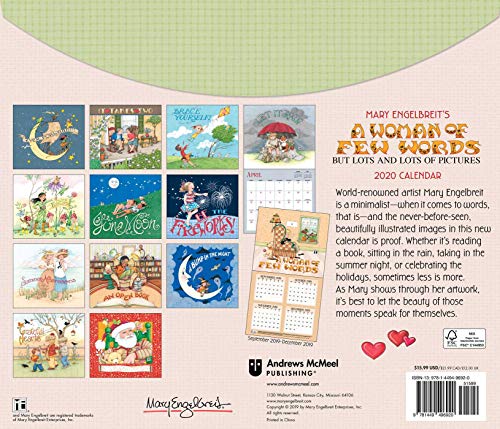 World-renowned artist, Mary Engelbreit is a minimalist–when it comes to words that is–and her new wall calendar, A Woman of Few Words, is proof. Packaged in its own full-color decorative envelope, the calendar features a never-before-seen, beautifully-colored drawing from Mary each month, and the grid offers plenty of room to jot down important events and special occasions.