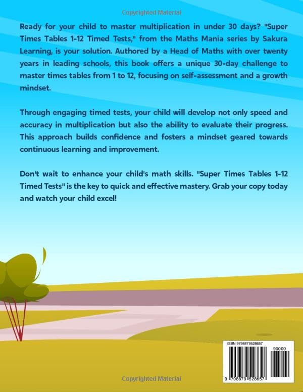 Unlock Mastery Over Multiplication Is your child struggling with multiplication? Transform their understanding and recall of times tables in just 30 days with our revolutionary approach! “Master Multiplication in 30 Days: Super Times Tables Challenge” is the ultimate 5-in-1 resource that makes learning fast, fun, and effective for Grades 7-11. Engaging Timed Challenges with a Splash of Colour Dive into a world of engaging, timed tests designed by a seasoned Head of Maths with over two decades of experience in leading schools. This book from the Maths Mania series is meticulously crafted to help your child conquer times tables from 1 to 12. Each page is a step towards mastery, with challenges that cater to various learning speeds and styles, complemented by colourful, fun, and friendly illustrations to keep the learning process lively and enjoyable. Growth and Confidence in Every Colorful Page Imagine your child’s pride as they progress through our 30-day challenge, equipped with self-assessment tools and a growth mindset. They’ll gain speed, accuracy, and the confidence to tackle more complex math problems. With our clear, reproducible practice sheets and vibrant, inviting pictures, they’ll achieve fluency in multiplication facts and develop instant recall — essential skills for academic success. Easy-To-Use, Parent-Friendly, and Visually Stimulating Features: 5 Books in One: Packed with material equivalent to five separate workbooks, enriched with vibrant visuals. Self-Assessment Tools: Empower your child to track and celebrate their progress with the joy of colorful imagery. Answer Key Included: Quick and easy way for students to check their own work amidst a visually engaging layout. Colorful, Fun, and Friendly Illustrations: Keep your child engaged with delightful images that make learning a pleasure. Take Action Today Don’t miss out on this opportunity to enhance your child’s maths skills with a splash of colour. Grab your copy of “Master Multiplication in 30 Days: Super Times Tables Challenge” now and take the first step towards turning multiplication mastery into a rewarding and visually exciting journey for your child!