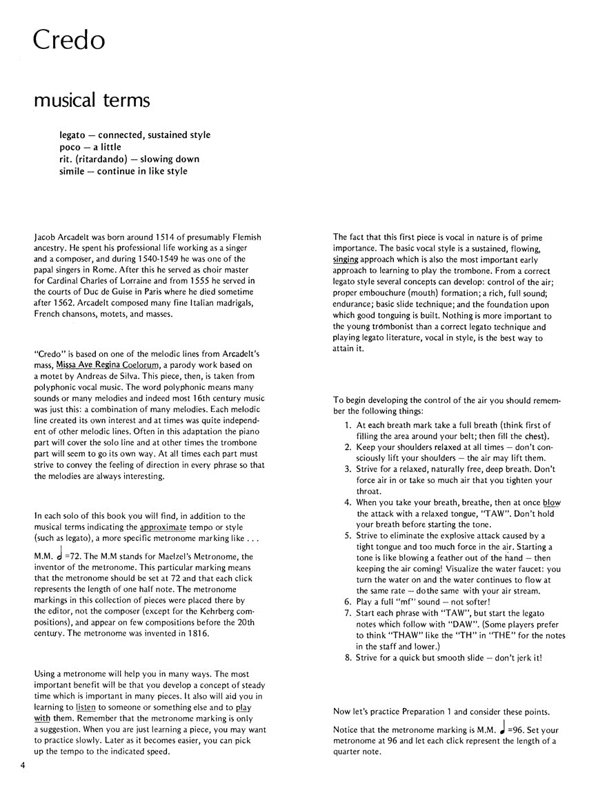 (Master Solos). This collection for trombone was personally selected and performed by world-famous performing artist and educator, Buddy Baker. Includes 8 selections by renowned composers and a piano accompaniment book. The accompanying audio features two tracks for each piece: one featuring the solo performance with piano accompaniment, and the second track is the piano accompaniment only. Edited by Linda Rutherford. Audio is accessed online using the unique code inside the book and can be streamed or downloaded. The audio files include PLAYBACK+, a multi-functional audio player that allows you to slow down audio without changing pitch, set loop points, change keys, and pan left or right.