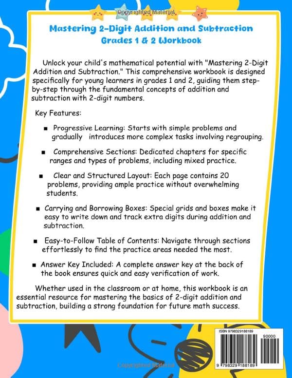 Unlock your child’s mathematical potential with “Mastering 2-Digit Addition and Subtraction.” This comprehensive workbook is designed specifically for young learners in grades 1 and 2, guiding them step-by-step through the fundamental concepts of addition and subtraction with 2-digit numbers. Key Features: Progressive Learning: Starts with simple problems and gradually introduces more complex tasks involving regrouping. Comprehensive Sections: Dedicated chapters for specific ranges and types of problems, including mixed practice. Clear and Structured Layout: Each page contains 20 problems, providing ample practice without overwhelming students. Carrying and Borrowing Boxes: Special grids and boxes make it easy to write down and track extra digits during addition and subtraction. Easy-to-Follow Table of Contents: Navigate through sections effortlessly to find the most needed practice areas. Answer Key Included: A complete answer key at the back of the book ensures quick and easy verification of work. Whether used in the classroom or at home, this workbook is essential for mastering the basics of 2-digit addition and subtraction and building a strong foundation for future math success.