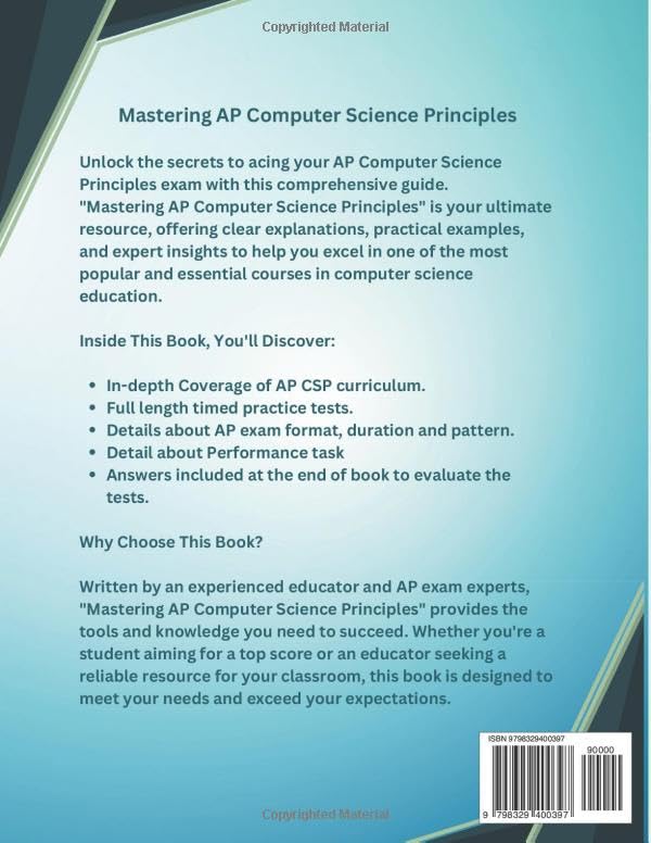 Mastering AP Computer Science Principles: Edition 2025 Achieve excellence in your AP Computer Science Principles test with “Mastering AP Computer Science Principles.” It include everything you need to achieve a perfect 5 on AP Computer Science Principles Exam. This comprehensive guide is crafted to help students understand the fundamental concepts of computer science principles in less time, ensuring thorough preparation for the AP CSP exam. Inside this book, you will find: In-depth Coverage of Key Concepts: Dive into the essential topics, Big Ideas, and Performance Tasks of the AP Computer Science Principles curriculum, including algorithms, data structures, programming, the internet, and the societal impacts of computing. Each chapter is designed to build your knowledge step by step, making complex ideas accessible and engaging. Practice Tests: Benefit from three full-length, timed practice tests that simulate the real exam experience. Answers are provided at the end to facilitate self-assessment and track your progress. Detailed guidance on the Performance Task is also included. Exam Strategies and Tips: Gain valuable insights into the AP exam format, question types, and scoring guidelines, helping you approach the test with confidence. Vocabulary Review Sections: Consolidate your learning with comprehensive vocabulary review sections, ensuring you grasp and remember key terms and concepts. Complete Prep Guide: “Mastering AP Computer Science Principles” serves as a perfect prep guide for the entire CSP course, as well as for quick revisions. Coverage of Crucial Topics: Understand the broader impact of computer science on society and how it drives innovation in various fields. Learn about ethical considerations, data privacy, and the transformative power of technology. “Mastering AP Computer Science Principles” is more than just a study guide; it is your companion in mastering the principles of computer science. Whether you’re new to the subject or seeking to deepen your understanding, this book provides the tools and knowledge you need to succeed in the AP course and beyond.