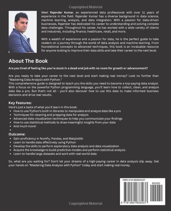 Are you tired of feeling like you’re stuck in a dead-end job with no room for growth or advancement? Are you ready to take your career to the next level and start making real money? Look no further than “Mastering Data Analysis with Python.” This comprehensive guide is designed to teach you the skills you need to become a top-paying data analyst. With a focus on the powerful Python programming language, you’ll learn how to collect, clean, and analyze data like a pro. But that’s not all – you’ll also discover how to use this data to make informed business decisions and drive real results. KEY FEATURES: How to use Python’s built-in libraries to manipulate and analyze data like a pro Techniques for cleaning and prepping data for analysis Advanced data visualization techniques to help you communicate your findings How to use statistical methods to draw meaningful insights from your data And much more! WHO THIS BOOK IS FOR? Data analysts and scientists who want to learn how to use Python for data analysis Programmers who want to add data analysis skills to their repertoire Anyone interested in exploring and visualizing data using Python Students and professionals looking to improve their data analysis and visualization skills Individuals interested in machine learning and artificial intelligence who need to learn data analysis fundamentals. WHAT OTHER PEOPLE SAYS: But don’t just take our word for it. Here’s what some of our readers have had to say: “I’ve been working as a data analyst for a few years now, but this book taught me so many new techniques that I was able to immediately apply to my job and start making more money.” “I’ve always been interested in data analysis, but I didn’t know where to start. This book is the perfect introduction to the field and has helped me land my dream job.” “I was able to use the skills I learned in this book to negotiate a raise and make an additional $100,000 per year!” OUTCOMES Gain proficiency in NumPy, Pandas, and Matplotlib Learn to handle data effectively using Python Develop the skills to perform exploratory data analysis and data visualization Acquire the knowledge to build predictive models and perform statistical analysis Learn to handle large datasets and work with real-world data Master the skills to communicate data insights effectively Gain confidence in using Python for data analysis and visualization TABLE OF CONTENTS Introduction to Data Analysis with Python Getting Started with Python Built-in Data Structures, Functions, and Files Data Wrangling NumPy for Data Analysis Pandas for Data Analysis Descriptive Statistics for Data Analysis Data Exploration Data Exploration Matplotlib for Data visualization Data Visualization Data Analysis in Business Additional Resources for Further Learning Insider Secrets for Success as A Data Analyst Glossary So, what are you waiting for? Don’t let your dreams of a high-paying career in data analysis slip away. Get your hands on “Mastering Data Analysis with Python” today and start making real money.