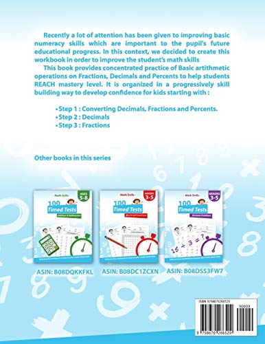 This book contains 100 math timed worksheets with over 3,200 Problems, it focuses on converting between fractions, decimals, and percentages. Also on Reducing Fractions etc… The activities in this book are divided into 6 units: 1. Converting Fractions, Decimals and Percents 2. Simplifying Fractions 3. Adding Multiplying and Dividing Fractions 4. Adding Multiplying and Dividing Decimals 5. Word Problems 6. Answer Key Recommended for Grade 4, Grade 5 and Grade 6