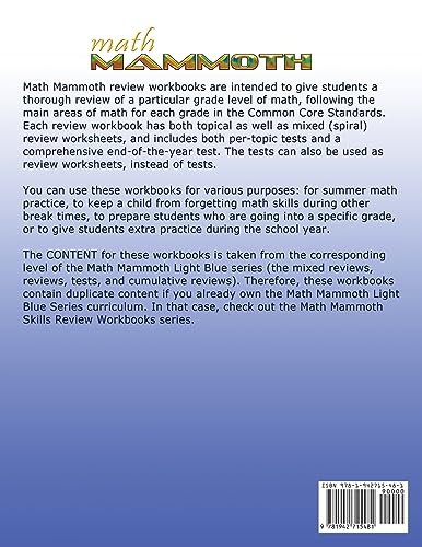 Math Mammoth Grade 7 Review Workbook is intended to give students a thorough review of pre-algebra/7th grade math. It has both topical as well as mixed (spiral) review worksheets, and includes both topical tests and a comprehensive end-of-the-year test. The tests can also be used as review worksheets, instead of tests. You can use this workbook for various purposes: for summer math practice, to keep a child from forgetting math skills during other break times, to prepare students who are going into algebra 1, or to give pre-algebra students extra practice during the school year. The topics reviewed in this workbook are: basics of algebra integers one-step equations rational numbers equations and inequalities ratios and proportions percent geometry the Pythagorean Theorem probability statistics In addition to the topical reviews and tests, the workbook also contains many cumulative (spiral) review pages. The content for these is taken from Math Mammoth Grade 7 Complete Curriculum. However, the content follows a typical pre-algebra course, so this workbook can be used no matter which math curriculum you follow. Please note this book does not contain lessons or instruction for the topics. It is not intended for initial teaching. It also will not work if the student needs to completely re-study these topics (the student has not learned the topics at all). For that purpose, please consider Math Mammoth Grade 7 Complete Curriculum, which has all the necessary instruction and lessons.