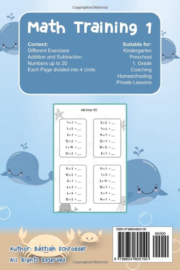 Unlock the secret to math readiness and supercharge your child’s learning adventure with “Math Training 1 Pocket Edition” – the ultimate workbook crafted to enhance addition and subtraction skills for Pre-K and early elementary school kids. Prepare your young learners for a math-filled journey of excitement and success! Key Features: Endless Repetition, Infinite Success: Repetition is the key to mastering math, and this workbook delivers! With plenty of stimulating addition and subtraction exercises, your child will swiftly conquer numbers 0-20. Prepare them for a lifetime of math proficiency. Number Bonding Unleashed: Say hello to accelerated learning! Your little mathematician will effortlessly apply these principles to all addition and subtraction problems, developing a rock-solid foundation. Engaging and Interactive: Learning math has never been this fun! Dive into hundreds of repetition and number bonding exercises that will accelerate math readiness for kindergarteners, first graders, and Pre-K children. Watch as their confidence soars! Versatile and Convenient: Whether you’re a homeschooling parent, a teacher in preschool or kindergarten, or looking for extra math coaching, this workbook is your go-to resource. It’s perfect for any math setting, from classrooms to summer bridge activities. Structured for Success: The workbook’s pages are thoughtfully divided into four sets of addition and subtraction units. This structured approach ensures seamless progress and keeps your child engaged throughout the learning journey. Designed for all skill levels: Whether your child is just starting to explore addition and subtraction or needs a little fine-tuning to excel, “Math Training 1 Pocket Edtition” is tailor-made for all skill levels. Watch their math proficiency soar to new heights! Includes lovely crafted drawings Motivation: track progress of finished pages Add a touch of magic to your child’s mathematical journey with “Math Training 1” – the ultimate workbook designed to make math exciting, engaging, and empowering. Whether you’re a parent, teacher, or tutor, this book will ignite a lifelong love for numbers and set your child on the path to mathematical brilliance. Get ready to witness the astonishing progress as your little one becomes a math superstar! Page up and order now! What others have searched: Math readiness workbook, Addition and subtraction for kids, Number bonding principles, Homeschool math curriculum, Kindergarten math practice, Interactive math exercises, Accelerated learning for young learners, Math coaching for children, Summer bridge math activities, Boosting basic math skills.