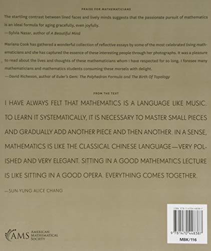 Mathematicians is a remarkable collection of ninety-two photographic portraits, featuring a selection of the most impressive mathematicians of our time. Acclaimed photographer Mariana Cook captures the exuberance and passion of these brilliant thinkers. The superb images are accompanied by autobiographical texts written by each mathematician. Together, the photographs and words illuminate a diverse group of men and women dedicated to the absorbing pursuit of mathematics. The compelling black-and-white portraits introduce readers to mathematicians who are both young and old and from notably diverse backgrounds. They include Fields Medal winners, those at the beginning of major careers, and those who are long-established celebrities in the discipline. Their candid personal essays reveal unique and wide-ranging thoughts, opinions, and humor. The mathematicians discuss how they became interested in mathematics, why they love the subject, how they remain motivated in the face of mathematical challenges, and how their greatest contributions have paved new directions for future generations. Mathematicians in the book include Jean-Pierre Serre, Henri Cartan, Karen Uhlenbeck, David Blackwell, Eli Stein, John Conway, Timothy Gowers, Frances Kirwan, Peter Lax, William Massey, John Milnor, Cathleen Morawetz, John Nash, Pierre Deligne, and James Simons. This book conveys the beauty and joy of mathematics to readers outside the field as well as those in it. These pictures and their texts are an inspiration, and a perfect gift for those who love mathematics as well as for those who think they can’t do it!