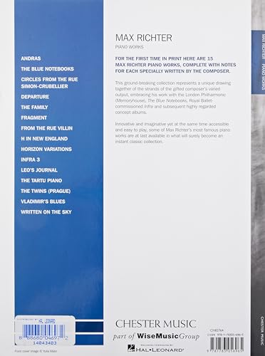 (Music Sales America). For the first time in print, 15 works complete with notes for each written by Max Richter. Selections include The Blue Notebooks , Infra 3 , Leo’s Journal and more.
