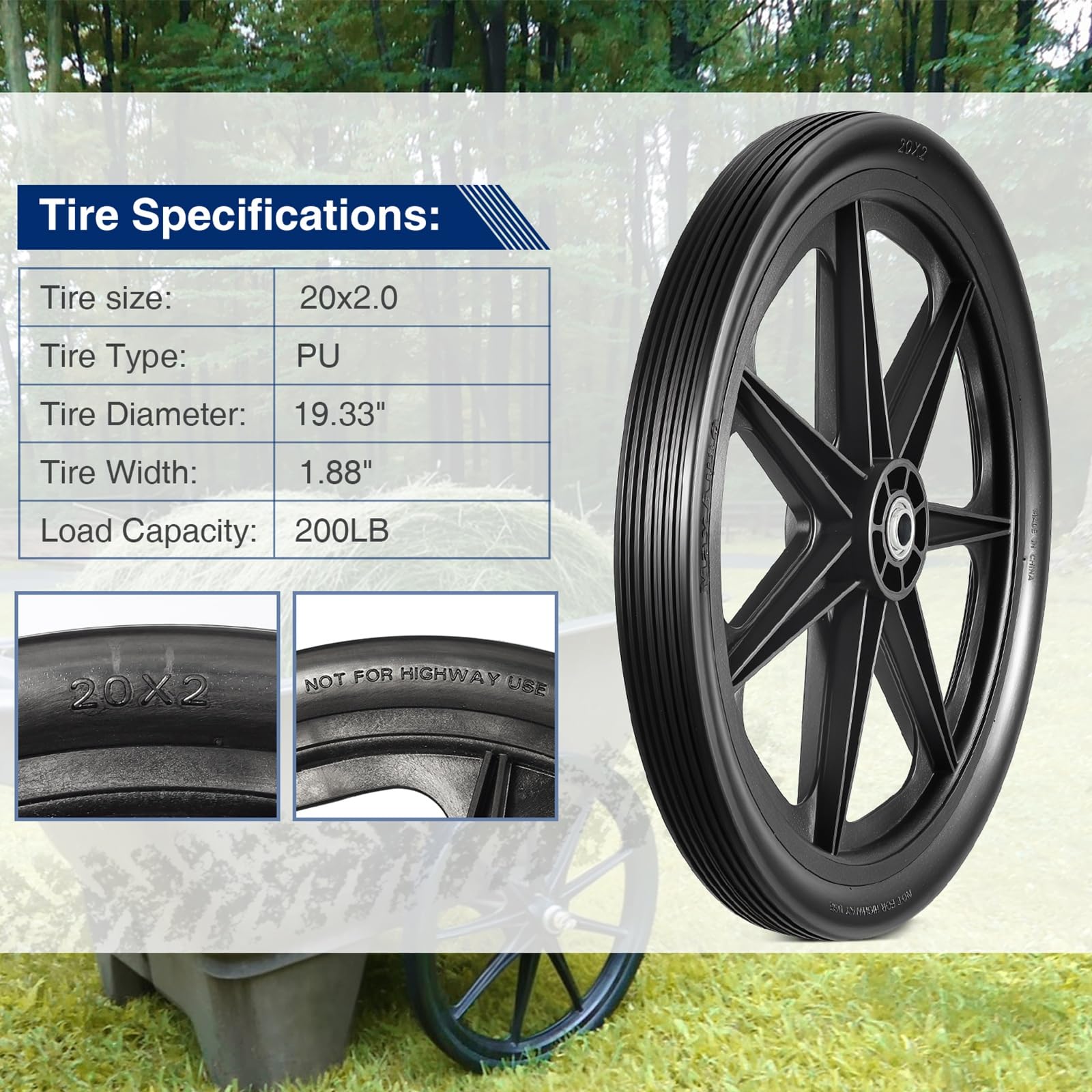- [(Package Include)] 1 Set = 2 Piece 20×2.0″ Wheelbarrow Tires.!!!NOT for highway use!!!