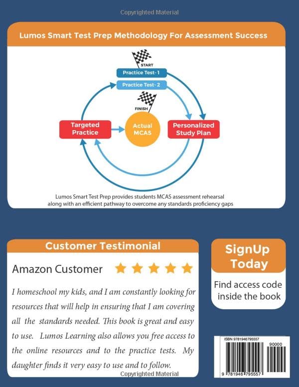 Massachusetts Comprehensive Assessment System (MCAS) 6th Grade English Language Arts Workbook for Kids (Ages 11-12) updated for 2023-24. Boost your child’s MCAS test scores using the Lumos Grade 6 English language Arts Test Prep Workbook. Crafted by expert educators, this workbook comprehensively covers over 40+ essential ELA skills tailored for sixth graders. Featuring a wide variety of standards-aligned practice questions, the Lumos MCAS workbook supports your child to enhance ELA proficiency through consistent daily and weekly practice, resulting in improved MCAS test scores. Why You’ll Love This 6th Grade English Book for 2023-24 MCAS Test Prep Excel in 40+ Essential ELA Skills: Master key ELA concepts including Reading: Literature, Reading: Informational Text, and Language. This comprehensive workbook fosters not just success in the Massachusetts State assessment, but also cultivates a robust academic groundwork. Boost State Test Success: Lumos MCAS test prep workbooks break free from traditional print workbooks. It features a wide variety of standards-aligned content in both print and online formats. Lumos Smart Test Prep Methodology: Unlock success on the Massachusetts State test (MCAS) powered by our proprietary Lumos Smart Test Prep Methodology. It provides simulated MCAS practice and remediation tools to overcome proficiency gaps. Replicated MCAS Practice: Access 2 full-length online practice tests mirroring the MCAS blueprint–question types, tech-enhanced items, duration, rigor of the standards, and more. Plus, the look and feel are the same as the actual MCAS computerized test, fostering comfort with the MCAS format, and boosting test readiness. Important Note: Once you register for the online program, the first practice test gets auto-assigned by Lumos Support. Targeted Auto-remediation Powered by AI: Based on your child’s performance on the online MCAS-like practice tests, the program uses AI to automatically assign personalized remedial practice assignments to address specific skill gaps. Track Your Child’s Progress and Growth: Gain valuable insights with an intuitive dashboard in the online program to monitor advancement and pinpoint strong and weak areas. About Lumos Learning Lumos Learning has been a trusted partner in providing state test preparation resources to parents and educators for over 16 years. With an impressive reach of over 1 million students, 125,000 teachers, and 44,000 schools, our proven study programs improve student outcomes in state assessments. Versatile and Flexible Learning Solution At-Home Learning Classroom Learning Home Tutoring & Home Schooling. Resources in the Print Workbook 3 chapters covering 40+ ELA skills Answer keys with detailed explanations Resources in the Online Program 2 full-length practice tests mirroring the MCAS blueprint AI-driven targeted auto-remediation to address skill gaps Supplementary resources: solved examples, videos, and more User-friendly dashboard and performance reports for progress measurement Access MCAS Online Resources in 3 Easy Steps Scan the QR code or visit www.lumoslearning.com/a/tedbooks Enter the access code provided within the print workbook Provide basic details and get started! Grab your copy of the Lumos MCAS 6th-grade English Language Arts workbook today and boost your child’s Massachusetts State test scores!