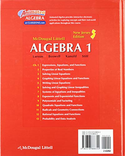 New Jersey edition of Larson Algebra 1. Same as national edition with integrated material directed at New Jersey curriculum review.