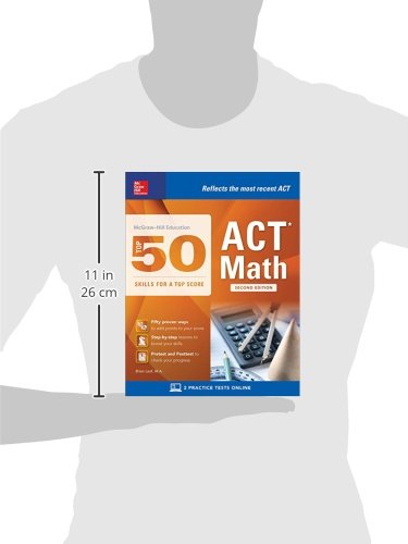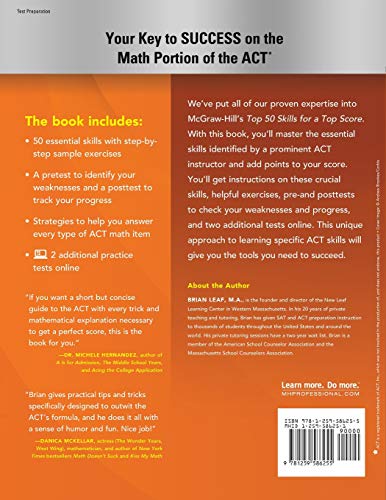 Publisher’s Note: Productspurchased from Third Party sellers are not guaranteed by the publisher forquality, authenticity, or access to any online entitlements included with theproduct. This go-to study guideprovides the concepts, study strategies, and practice you need to dramaticallyraise your ACT scores in English, Reading, and Science areas of the exam. McGraw-Hill: Top 50 ACTMath Skills for a Top Score, second edition presentsthe heart of each of the 50 most important concepts in this subject area.Within each topic, exercises help you build critical skills and illustrate howeach concept is tested on the ACT. Written by a test-prep expert with years ofexperience with the SAT and ACT preparation, this easy-to-use book features: A pretest designed to identify your weaknesses in the Math areas ACT traditionally focuses on Two-to-four page spreads with lessons that increase your knowledge in the 50 essential skills with step-by-step sample exercises A posttest designed to track the progress of each specific skill A full answer key with helpful explanations 2 extra tests online