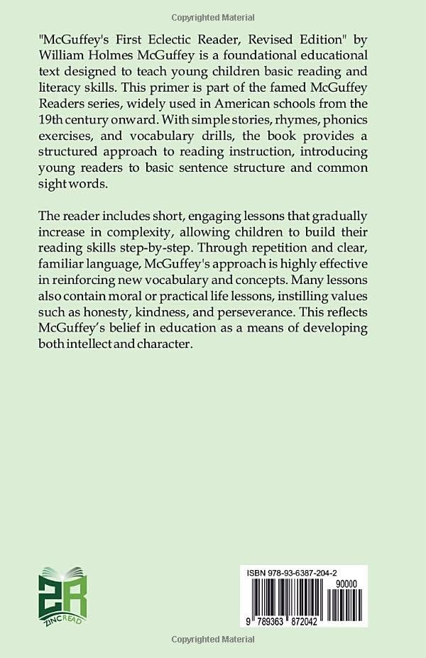 “McGuffey’s First Eclectic Reader, Revised Edition” by William Holmes McGuffey is a foundational educational text designed to teach young children basic reading and literacy skills. This primer is part of the famed McGuffey Readers series, widely used in American schools from the 19th century onward. With simple stories, rhymes, phonics exercises, and vocabulary drills, the book provides a structured approach to reading instruction, introducing young readers to basic sentence structure and common sight words. The reader includes short, engaging lessons that gradually increase in complexity, allowing children to build their reading skills step-by-step. Through repetition and clear, familiar language, McGuffey’s approach is highly effective in reinforcing new vocabulary and concepts. Many lessons also contain moral or practical life lessons, instilling values such as honesty, kindness, and perseverance. This reflects McGuffey’s belief in education as a means of developing both intellect and character.