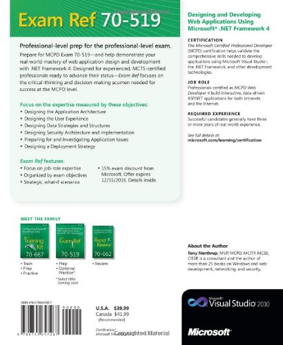 Prepare for MCPD Exam 70-519–and help demonstrate your real-world mastery of web application design and development–with this official Microsoft(r) Exam Ref. Written for experienced, MCTS-certified professionals ready to advance their status–this guide focuses on the critical-thinking and decision-making acumen needed for success at the MCPD level. With concise, objective-by-objective reviews, strategic case scenarios, and “Thought Experiments”, you get professional-level preparation for the professional-level exam. Optimize your exam-prep by focusing on the expertise needed to: Design the application architecture Choose the right server-side and client-side technologies Design the user experience Design data access and presentation Plan for security Choose a testing methodology Plan for scalability and reliability You also get an exam discount voucher–making this book an exceptional value and a great career investment.