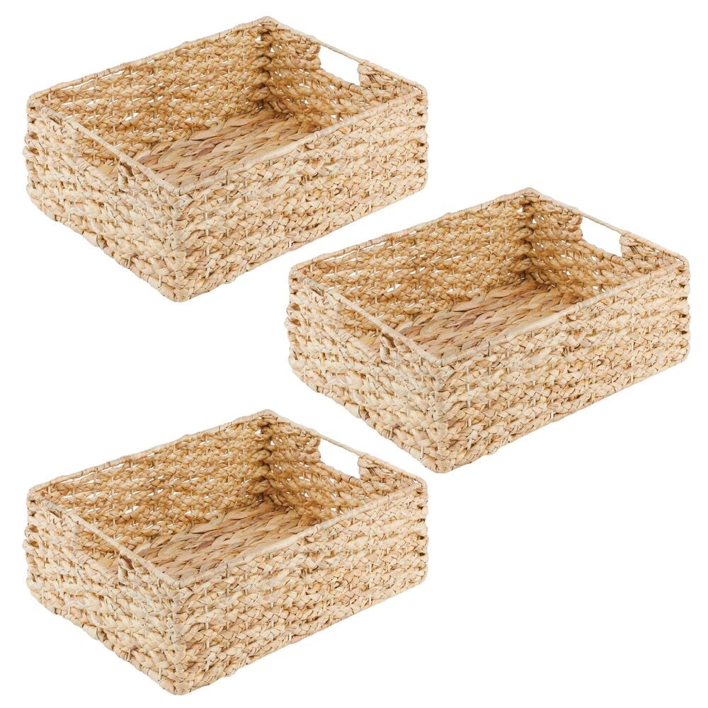 - BUILT-IN HANDLES: These storage baskets have integrated, built-in handles making them easy to pull on and off of shelves; Easy-carry handles let you transport bins throughout the kitchen; Move from cabinet or pantry shelves to table, island, or countertop; Use together to create a large organizational set or separate the items for coordinated storage throughout the room; Decorative and functional, these stylish and versatile baskets add a natural touch to any room in your home