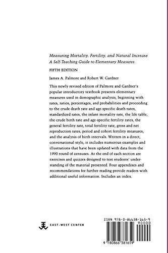 This revised edition of Palmore and Gardner’s popular introductory textbook presents elementary measures used in demographic analysis, beginning with rates, ratios, percentages, and probabilities and proceeding to the crude death rate and age-specific death rates, standardized rates, the infant mortality rate, the life table, the crude birth rate and age-specific fertility rates, the general fertility rate, total fertility rate, gross and net reproduction rates, period and cohort fertility measures, and the analysis of birth intervals. Written in a direct, conversational style, it includes numerous examples and illustrations that have been updated with data from the 1990 round of censuses. At the end of each section are exercises and quizzes designed to test students’ understanding of the material presented. Four appendixes and recommendations for further reading provide readers with additional useful information. Includes an index.
