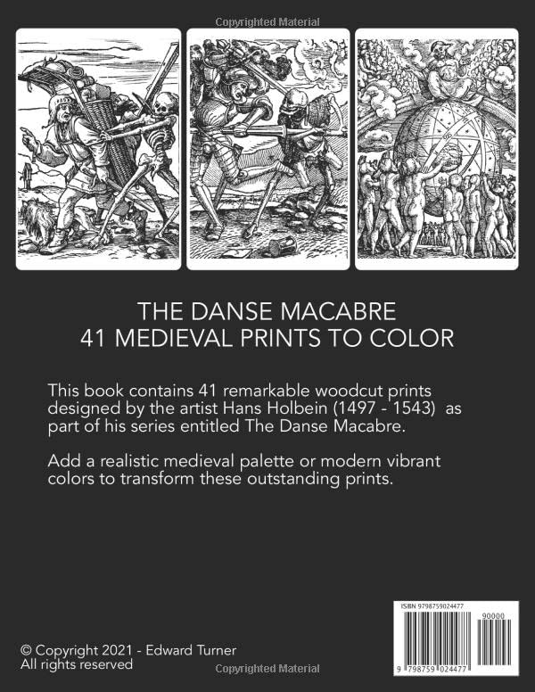 The perfect gift for anyone who wants to create unique art! This colouring book features intricate 16th Century woodcut prints from the artist Hans Holbein the Younger (1497-1543) for his series The Danse Macabre (The Dance of Death). The Danse Macabre is a portrayal on the universality of death that unites all levels of society. The images start with scenes of Adam and Eve being expelled from the Garden of Eden and move onto scenes in which various victims meet Death. Holbein’s images are seen as a contemporaneous rise of Protestantism during the 16th-century Reformation where followers began to reject Roman Catholic doctrines, indulgence, and excess. These 41 technical marvels were cut in small (65x50mm) blocks of wood by the virtuoso Hans Lutzelburger and considered a monumental achievement. They are full of mischief and will inspire your creative juices. Large size print, 8.5″ x 11″ Unique medieval artwork 41 artworks Suitable for older children and adults You’ll love colouring in your own masterpiece