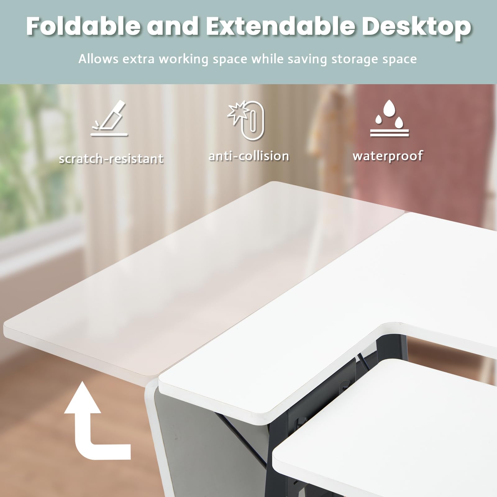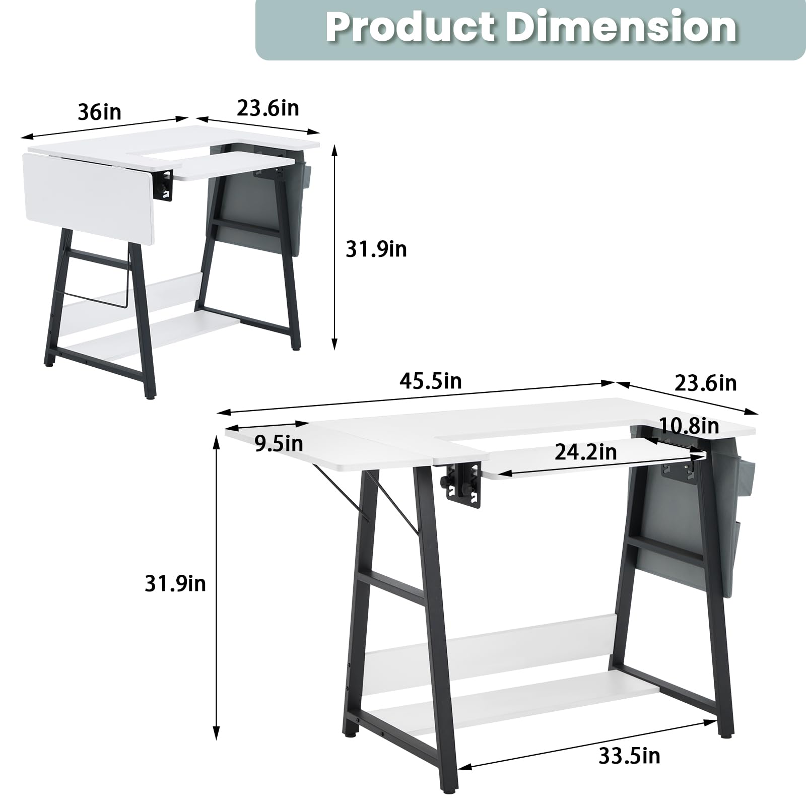 FOLDING MULTIPURPOSE SEWING TABLE: Featuring a flat desktop and a foldable 9.5-inch wide shelf, designed to accommodate a variety of creative activities to enhance productivity and creativity. Overall Dimensions: 45.5″ W x 23.6″ D x 31.9″ H