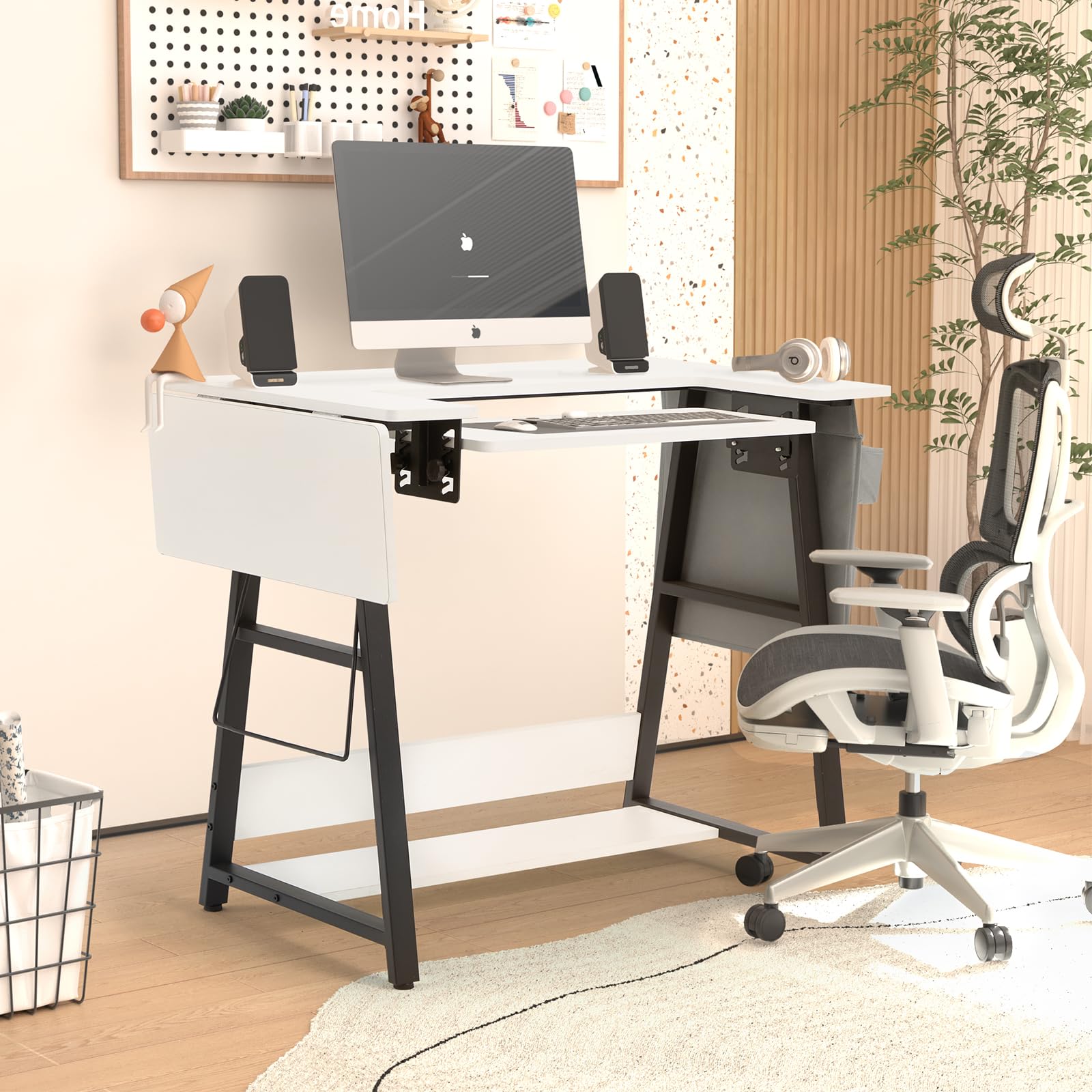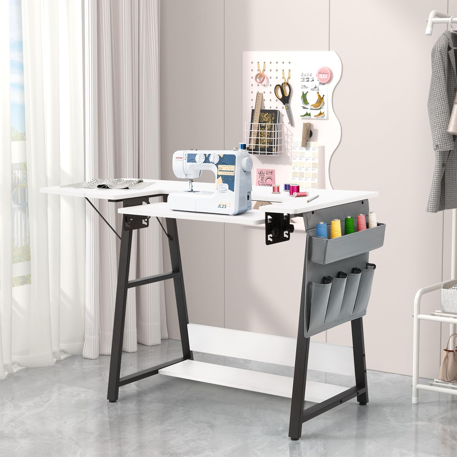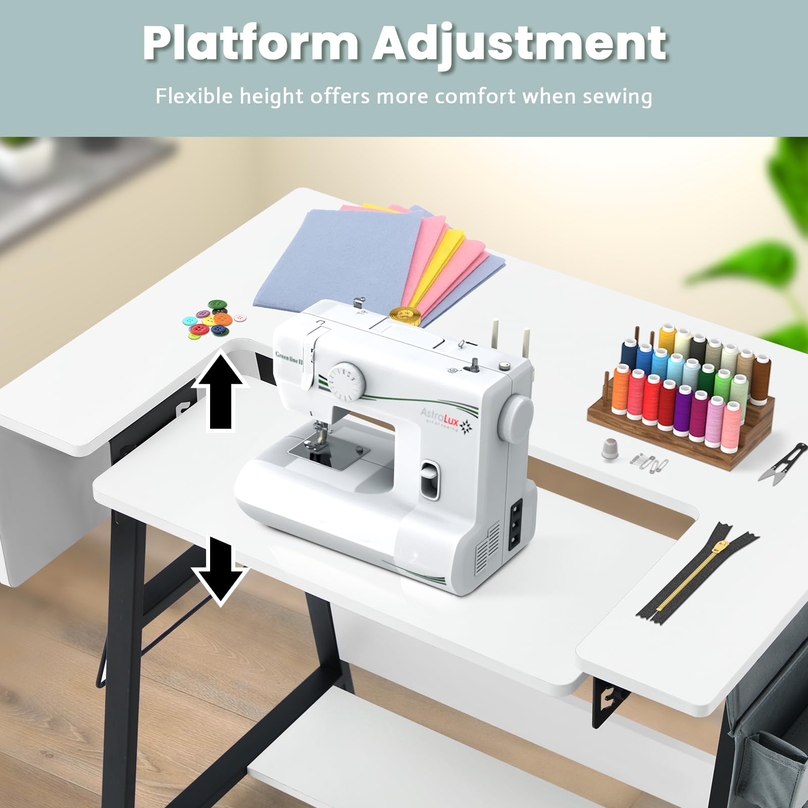 MELLCOM Folding Multipurpose Sewing Table, Hobby and Sewing Machine Table with Adjustable Shelf and Side Pocket- Can Also Be Used as Computer Desk, White