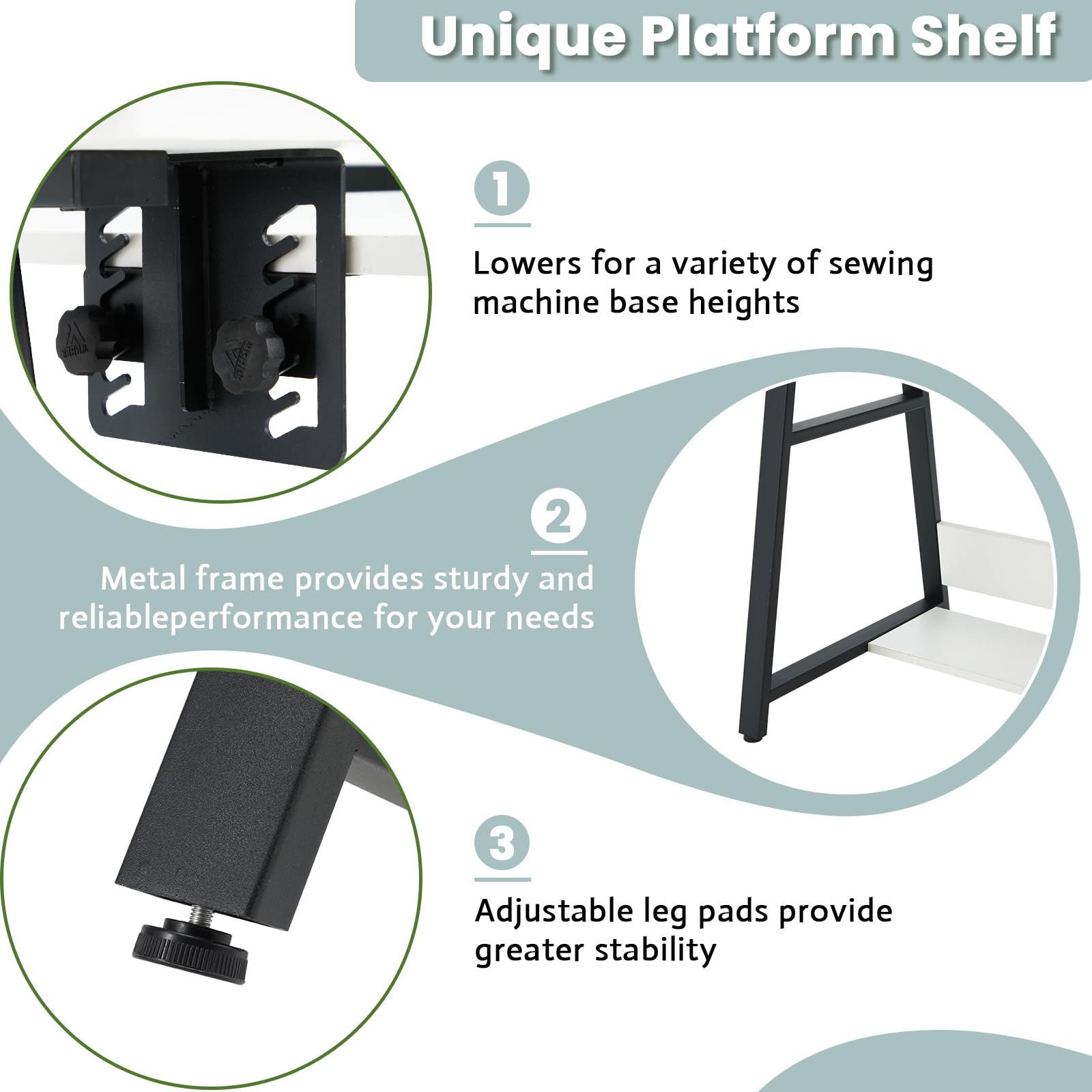 ADJUSTABLE RACK: Unique platform rack (24.2″ W x 10.8″ D) of the crafting table with 6 adjustable height positions to accommodate various sewing machine base heights, and can also be used as a place to store laptops or computer keyboards