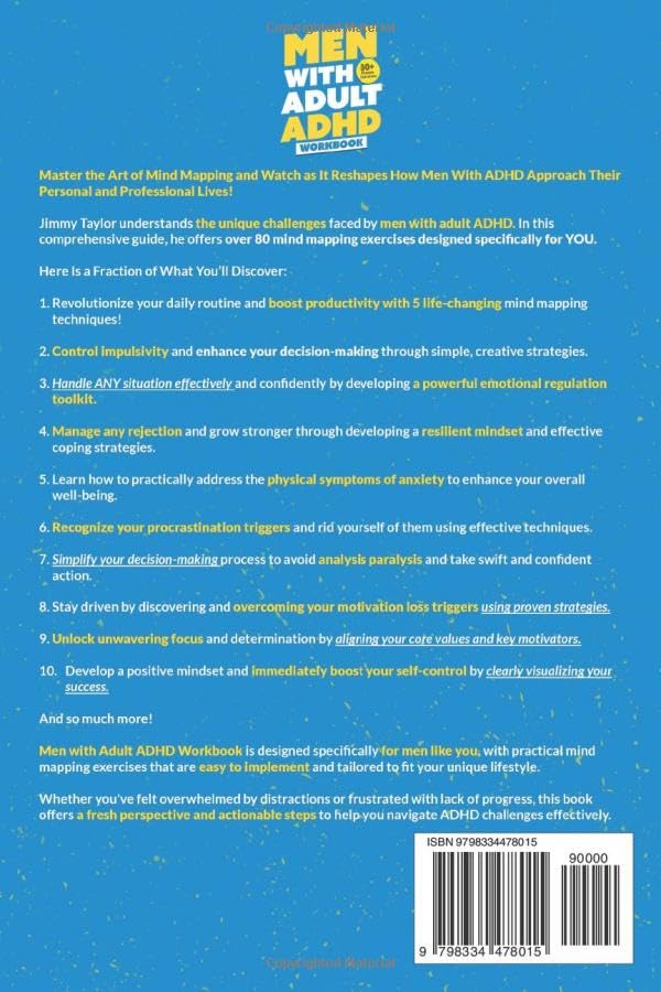 3 Free and Exclusive Bonuses Are Included with Your Purchase to Help You Stop ADHD Struggles Once and for All. Master the Art of Mind Mapping and Watch as It Reshapes How Men With ADHD Approach Their Personal and Professional Lives! Do you want to learn how to harness your ADHD creativity and turn visionary ideas into vibrant reality, regardless of past struggles with focus or motivation? Are you ready to eliminate overthinking and take control of your time? Do you find yourself overwhelmed by distractions, making it difficult to focus on important tasks? Do you want to overcome ADHD challenges and achieve peak productivity without sacrificing your peace of mind? If you answered ‘yes’ to any of these questions, the solution is Men with Adult ADHD Workbook. Jimmy Taylor understands the unique challenges faced by men with adult ADHD. In this comprehensive guide, he offers over 80 mind mapping exercises designed specifically for YOU. With Taylor’s insights and proven techniques, you’ll learn to harness your unique strengths and navigate the complexities of ADHD with confidence. Jimmy’s practical approach and deep understanding of ADHD will empower you to take control of your life, improve your time management, enhance your productivity, and build resilience. Here Is a Fraction of What You’ll Discover: Revolutionize your daily routine and boost productivity with 5 life-changing mind mapping techniques! Control impulsivity and enhance your decision-making through simple, creative strategies. Handle ANY situation effectively and confidently by developing a powerful emotional regulation toolkit. Manage any rejection and grow stronger through developing a resilient mindset and effective coping strategies. Learn how to practically address the physical symptoms of anxiety to enhance your overall well-being. Recognize your procrastination triggers and rid yourself of them using effective techniques. Simplify your decision-making process to avoid analysis paralysis and take swift and confident action. Stay driven by discovering and overcoming your motivation loss triggers using proven strategies. Unlock unwavering focus and determination by aligning your core values and key motivators. Develop a positive mindset and immediately boost your self-control by clearly visualizing your success. And so much more! Remember! With your purchase, you get access to three free and exclusive bonuses: ADHD Finance Management Guide: Offering five powerful tips on managing your finances better. The ABC Model: Teaching you simple, yet effective ways to control your impulsive behavior. A List of Apps: Helping you to improve and regulate many of your ADHD characteristics. Even if you’ve struggled with ADHD management techniques in the past, even if previous methods haven’t provided lasting results, and even if the thought of trying something new feels daunting–rest assured, Men with Adult ADHD Workbook is here to make a difference. Men with Adult ADHD Workbook is designed specifically for men like you, with practical mind mapping exercises that are easy to implement and tailored to fit your unique lifestyle. Jimmy Taylor’s approach addresses the real challenges you face and provides actionable strategies to help you thrive. Buy Your Copy NOW! Once you have this book in your hands, you’ll see your potential unfold like never before!