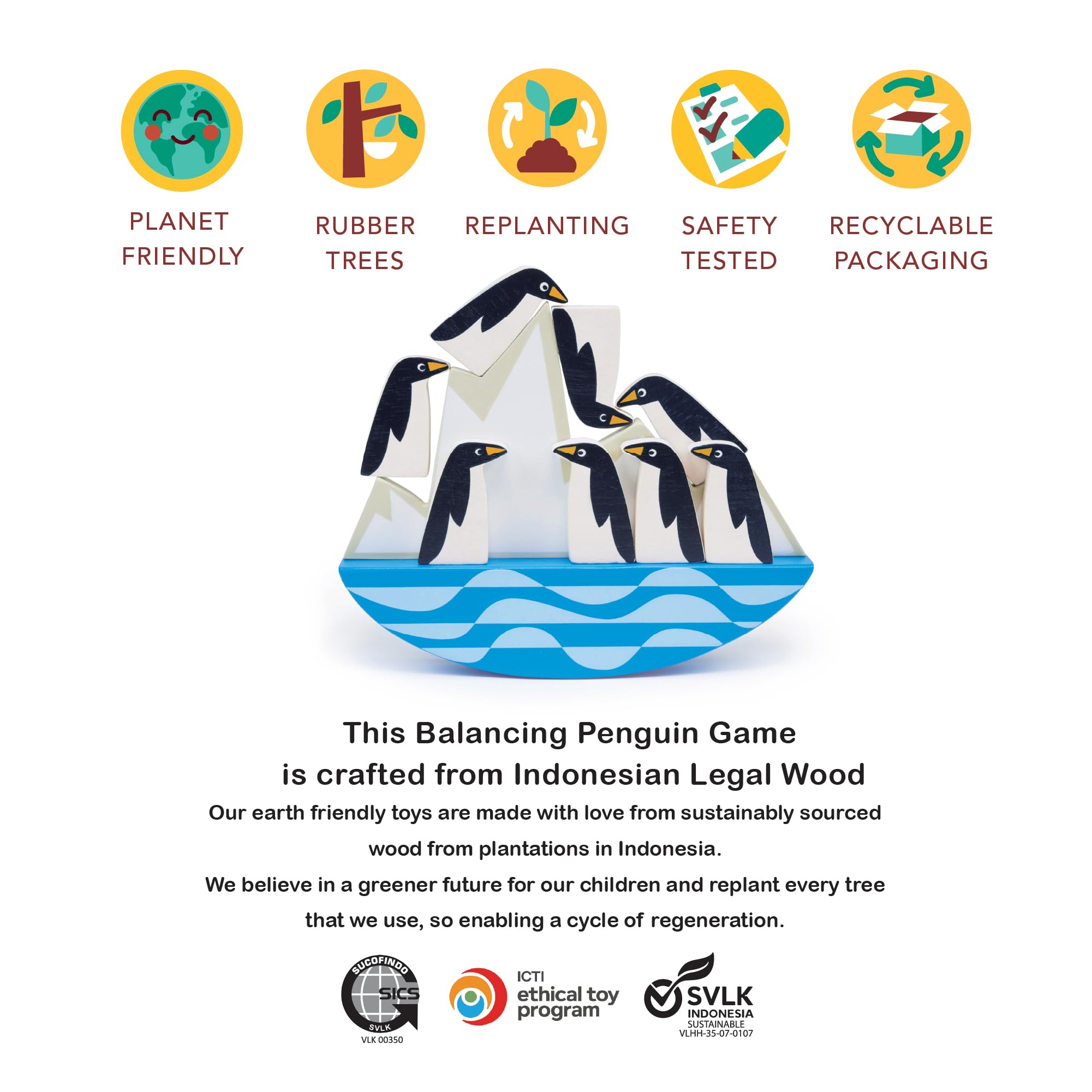 - ECO-FRIENDLY FUN – This gender-neutral set includes 8 solid wood penguins and a rocking wood iceberg. Pieces are crafted from durable rubber wood and colored with non-toxic paint. Product size 7.68 x 1.18 x 6.3 inches.