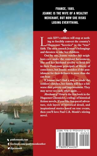 Amidst the opulence of Louis XIV’s France, a story of defiance and faith unfolds. In a time where faith and freedom clash, Jeanne Delpech de Castanet and her husband Jacob, stand as pillars of courage amidst the turmoil of Louis XIV’s reign of intolerance. Their life of privilege is under siege as the king’s soldiers ruthlessly target the Huguenot “heretics.” With their home ransacked and their children’s safety hanging by a thread, the couple’s resolve is pushed to its limits. Will their unwavering belief in their principles and liberty of conscience be enough to shield their family from the harrowing consequences of their defiance? Witness the struggle for faith, the fight for freedom, and the undying spirit of a couple who refuse to surrender their convictions. Merchants of Virtue is more than a novel–it’s a journey through the rich tapestry of history, inspired by true events. It’s the first gripping installment in the Huguenot Chronicles that promises adventure, historical depth, and an inspirational tale of resilience. Embrace the adventure, feel the courage, and discover the power of conviction. Get your copy of Merchants of Virtue today! Also available in print and audiobook formats. What Amazon readers are saying: “Compelling and enlightening, a must-read for lovers of historical fiction.” “As a Huguenot descendant, delighted by this meaningful story. Highlights the importance of family.” “Spell-binding! Couldn’t wait to continue reading after work.” “Great novel with well-drawn characters and an interesting historical background.” “An emotional journey through history, beautifully blending fact with fiction.”