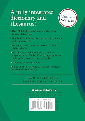 Revised and Updated Edition! Two essential language references integrated into one handy volume. More than 60,000 dictionary entries with hundreds of new words and senses added across a variety of fields. More than 13,500 thesaurus entries including extensive synonym and antonym lists. Dictionary and thesaurus entries are combined alphabetically. Features clear and concise word guidance including abundant usage examples to clarify meanings. Newly added words include: airplane mode, bucket list, dystopia, parkour, and truther. Based on the best-selling Merriam-Webster’s Collegiate(r) Dictionary.