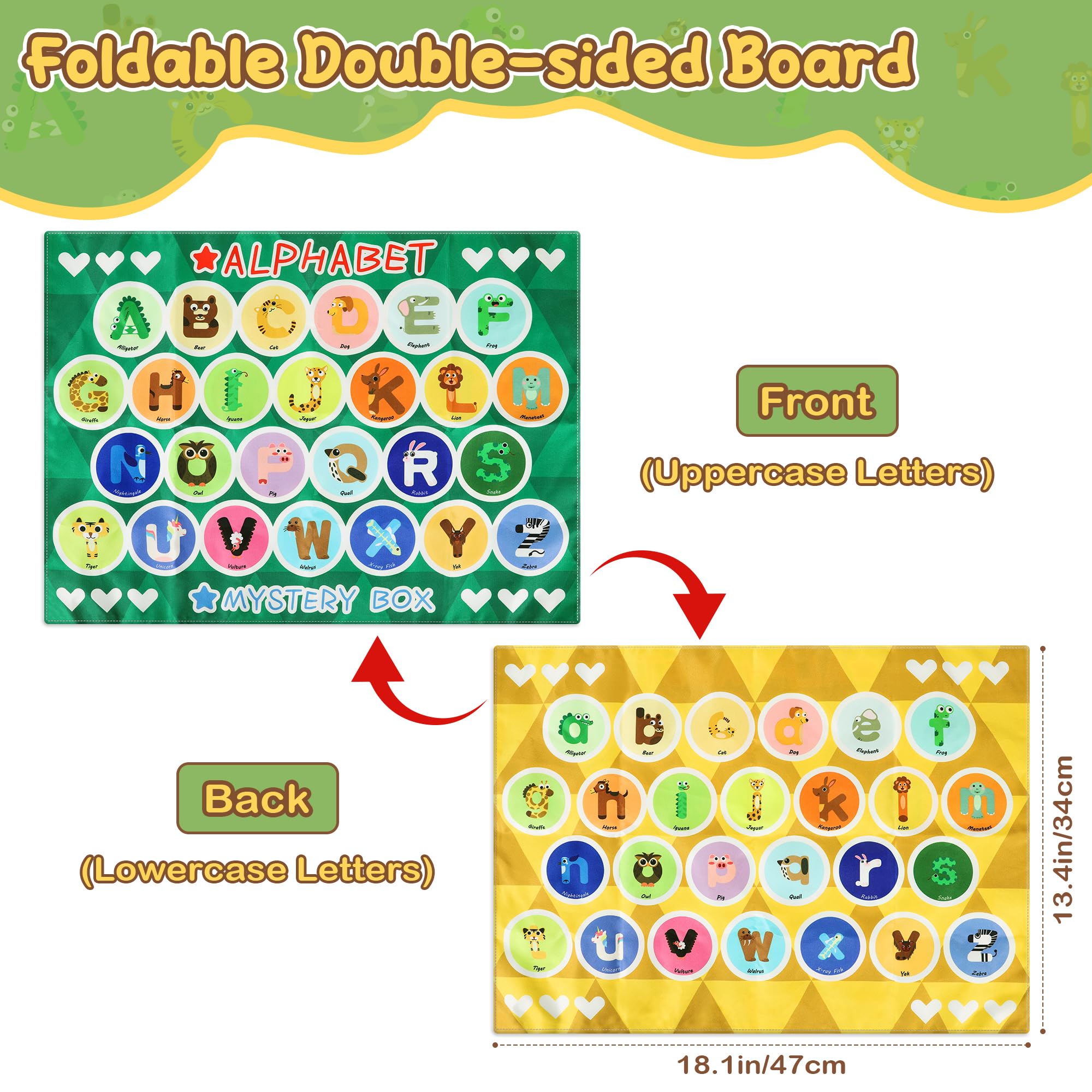- PERFECT FOR EARLY LEARNING : The double-sided game board features 26 animal-shaped letters (A to Z; a to z) for children to match the objects with. This alphabet mystery box makes learning letters fun and engaging, and helps children overcome common difficulties of matching uppercase and lowercase letters. Children can master the alphabet and letter sounds in a hands-on fun experience.
