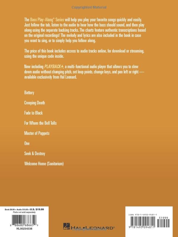 (Bass Play-Along). The Bass Play-Along Series will help you play your favorite songs quickly and easily! Just follow the tab, listen to the audio to hear how the bass should sound, and then play along using the separate backing tracks. The melody and lyrics are also included in the book in case you want to sing, or to simply help you follow along. The audio is available online for download or streaming, and it is enhanced so you can adjust the recording to any tempo without changing pitch! 8 songs: Battery * Creeping Death * Fade to Black * For Whom the Bell Tolls * Master of Puppets * One * Seek & Destroy * Welcome Home (Sanitarium).