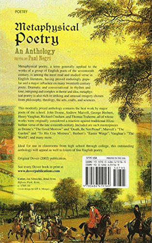 Metaphysical poetry, a term generally applied to the works of a group of English poets of the seventeenth century, is among the most read and studied verse in English literature, having proved enduringly popular and major influence on many twentieth-century poets. Dramatic and conversational in rhythm and tone, intriguing and complex in theme and idea, metaphysical poetry is also rich in striking and unusual imagery chosen from philosophy, theology, the arts, crafts, and sciences. This modestly priced anthology contains the best work by major poets of the school: John Donne, Andrew Marvell, George Herbert, Henry Vaughan, Richard Crashaw, Francis Quarles, and Thomas Traherne, all of whose works were originally considered a reaction against traditional Elizabethan verse of the late sixteenth century. Included are such masterpieces as Donne’s “The Good Morrow” and “Death, Be Not Proud”; Marvell’s “The Garden” and “To His Coy Mistress”; Herbert’s “Easter Wings”; Vaughan’s “The World,” and many more. Ideal for use in classrooms from high school through college, this outstanding anthology will appeal as well to lovers of fine English poetry.