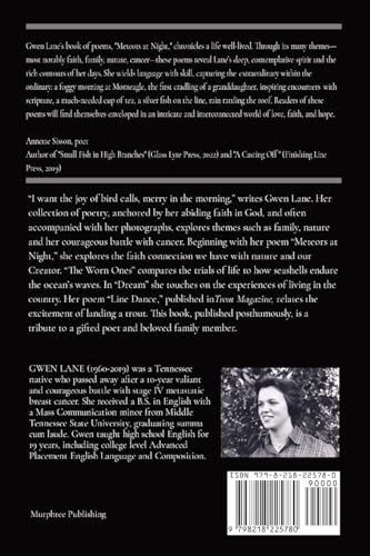 “I want the joy of bird calls, merry in the morning,” writes Gwen Lane. Her collection of poetry, anchored by her abiding faith in God, and often accompanied with her photographs, explores themes such as family, nature and her courageous battle with cancer. Beginning with her poem “Meteors at Night,” she explores the faith connection we have with nature and our Creator. “The Worn Ones” compares the trials of life to how seashells endure the ocean’s waves. In “Dream” she touches on the experiences of living in the country. Her poem “Line Dance,” published in Trout Magazine, relates the excitement of landing a trout. This book, published posthumously, is a tribute to a gifted poet and beloved family member.