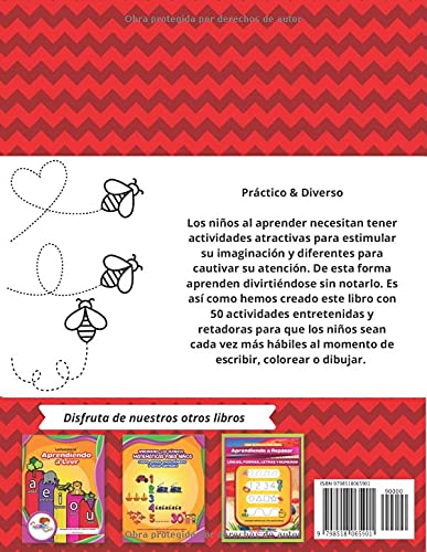 ?Sabias que el nino al ser capaz de repetir el trazo de manera identica es porque lo ha interiorizado? ?Quieres saber como puede alcanzar esta destreza? En este libro encontraras todo lo que se necesita para ello Las actividades de nuestro libro estan compuestas al principio para que el nino practique movimientos de base iniciales como los trazos verticales (arriba-abajo), horizontales (izquierda-derecha), evolucionando a los bucles, figuras hasta llegar a poder trazar con mayor agilidad letras y numeros. Esta practica activa su area cerebral contribuye significativamente a desarrollar su motricidad fina (destreza de manos y dedos), tambien permite un mayor dominio del antebrazo y la muneca. Compuesto por * Instrucciones claras para cada actividad * Actividades atractivas para conectar con su imaginacion * Ejercicios diversos para cautivar su atencion * 50 actividades increibles y maravillosas Completa y potencia el desarrollo de la escritura de los ninos con este material didactico realizado con mucho carino y determinacion para los ninos. !Compralo y que empiece la diversion!