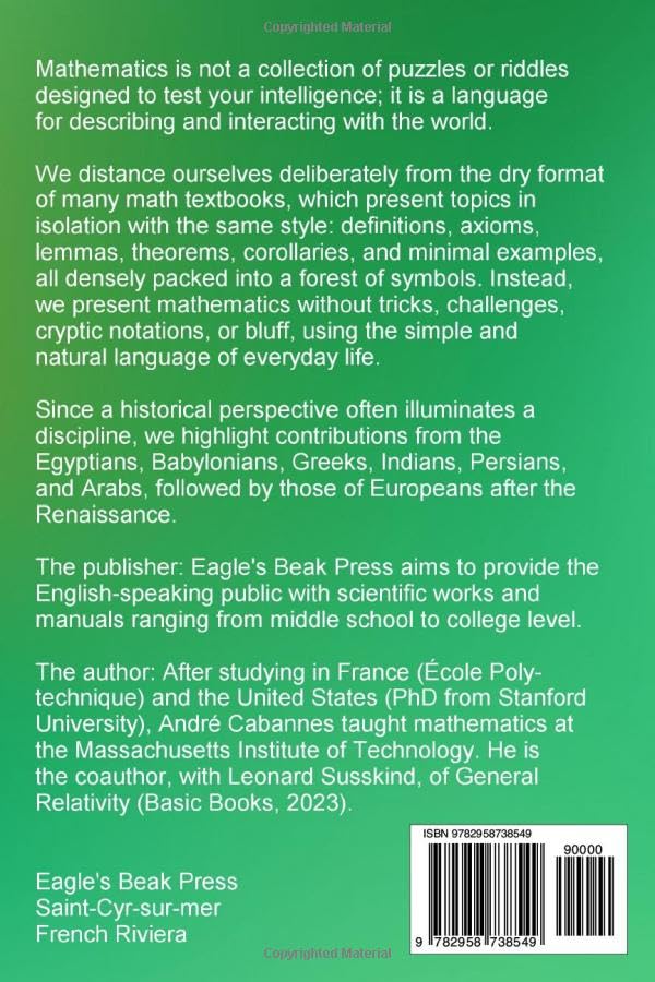Mathematics is not a collection of puzzles or riddles designed to test your intelligence. It is a language for describing and interacting with the world. Deliberately distancing ourselves from dry math textbooks — presentations of different subjects without connections, each time with the same format: definitions, axioms, lemmas, theorems, corollaries, and minimal examples, all laid out densely in a forest of symbols — we present mathematics without tricks, without challenges, without cryptic notations, and without bluff, using the simple and natural language of everyday life. We explain where all the tools come from (arithmetic, algebra, geometry, analytic geometry, functions, calculus, algebraic structures, linear algebra, matrices, probability, statistics, algorithmics), how they are interconnected, and what they are used for in mathematics, physics, engineering, and other fields. We aim to be understood by everyone, especially young people who grasp complex technologies and games when it’s for fun. However, this does not mean that mathematical concepts do not sometimes require effort and reflection. The 8th & 9th grade mathematics book completes the middle school math curriculum and even introduces some high school concepts. Middle school offers a comprehensive foundation of math applicable to everyday life. We encountered much of this material in primary school, though primarily as a set of methods; in secondary school, we delve into the underlying principles and broaden our view of mathematics as a whole. In our subsequent high school volumes, we begin to present the mathematics essential for engineers, physicists, professionals in various other disciplines, as well as future mathematicians. If you study and understand all the mathematics presented in our books from 6th to 12th grade, you will be well-prepared for college courses and beyond. Our philosophy of mathematics and how to teach it: https://tinyurl.com/5eejvhzx Table of contents: https://tinyurl.com/57vw2fvf Preface: https://tinyurl.com/mryy2hnt Free lesson: https://tinyurl.com/4rh9a23w Index: https://tinyurl.com/3pjnw2v7 Erratum: https://tinyurl.com/mrxrhyc2