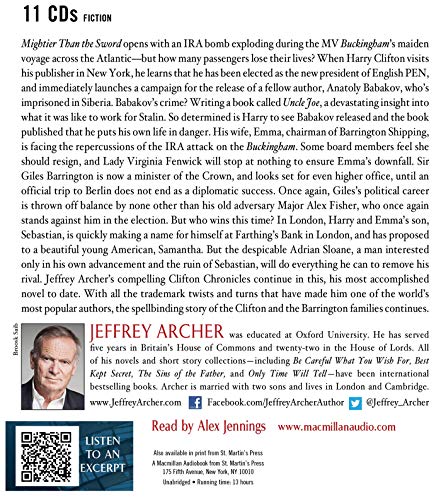 With more than 2 million copies in print, the Clifton Chronicles has taken #1 worldwide bestselling author Jeffrey Archer to a whole new level. And the saga continues with Mighter Than the Sword. Bestselling novelist Harry Clifton’s on a mission to free a fellow author who’s imprisoned in Siberia-even if doing so puts Harry’s own life, and life’s work, in danger. Meanwhile, his wife Emma, chairman of Barrington Shipping, is facing the repercussions of an IRA bombing on the Buckingham. Some board members feel she should resign. Others will stop at nothing to ensure the Clifton family’s fall from grace. In London, Harry and Emma’s son, Sebastian, is quickly making a name for himself at Farthing’s Bank. He’s also just proposed to a beautiful young American, Samantha. But the despicable Adrian Sloane is only interested in one thing: Sebastian’s ruin. Sir Giles Barrington, now a minister of the Crown, looks set for even higher office-until a diplomatic failure in Berlin threatens his prospects. Once again it appears that Giles’s political career is thrown off balance by none other than his old adversary, Major Alex Fisher. But who will win the election this time? And at what cost?