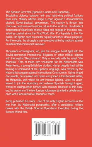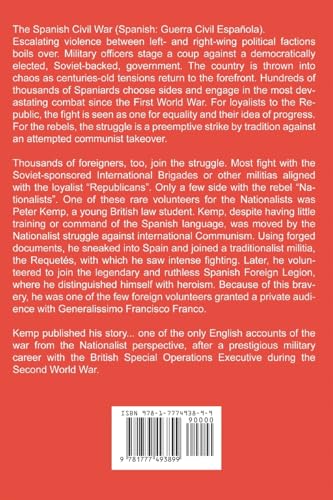 The Spanish Civil War (Spanish: Guerra Civil Espanola). Escalating violence between left- and right-wing political factions boils over. Military officers stage a coup against a democratically elected, Soviet-backed, government. The country is thrown into chaos as centuries-old tensions return to the forefront. Hundreds of thousands of Spaniards choose sides and engage in the most devastating combat since the First World War. For loyalists to the Republic, the fight is seen as one for equality and their idea of progress. For the rebels, the struggle is a preemptive strike by tradition against an attempted communist takeover. Thousands of foreigners, too, join the struggle. Most fight with the Soviet-sponsored International Brigades or other militias aligned with the loyalist “Republicans”. Only a few side with the rebel “Nationalists”. One of these rare volunteers for the Nationalists was Peter Kemp, a young British law student. Kemp, despite having little training or command of the Spanish language, was moved by the Nationalist struggle against international Communism. Using forged documents, he sneaked into Spain and joined a traditionalist militia, the Requetes, with which he saw intense fighting. Later, he volunteered to join the legendary and ruthless Spanish Foreign Legion, where he distinguished himself with heroism. Because of this bravery, he was one of the few foreign volunteers granted a private audience with Generalissimo Francisco Franco. Kemp published his story… one of the only English accounts of the war from the Nationalist perspective, after a prestigious military career with the British Special Operations Executive during the Second World War.