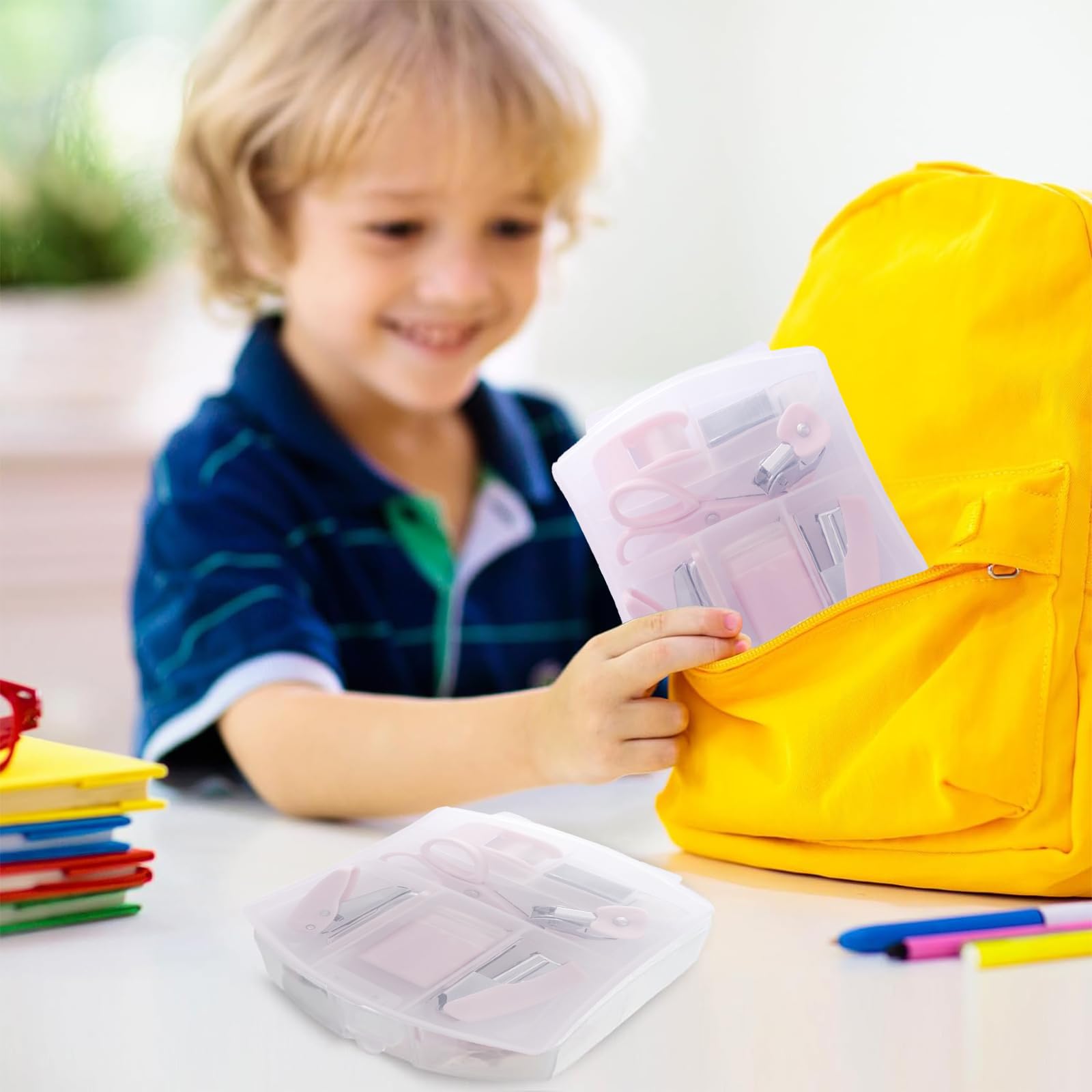 This portable kit provides essential school supplies like a stapler, scissors, and tape for completing assignments and organizing schoolwork.